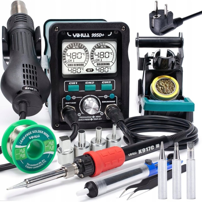 - Ten zestaw lutowniczy zawiera: 1 x urządzenie główne YIHUA 995D+ EVO, 1 x pistolet do lutowania, 1 x pistolet do gorącego powietrza, 1 x uchwyt do lutownicy X-2 (razem z zestawem do czyszczenia wełną mosiężną z topnikiem kalafonii), 3 x groty lutownicze, 4 x dysze gorącego powietrza, 1 x rolka bezolowiowego drutu lutowniczego, 1 x zestaw pęsety, 1 x przyssawka do lutowania, 1 x odkurzacz do lutownicy. Podnośnik IC. Wspaniały zestaw lutowniczy All-in-One do elektroniki lub jako zestaw do mikrolutowania.