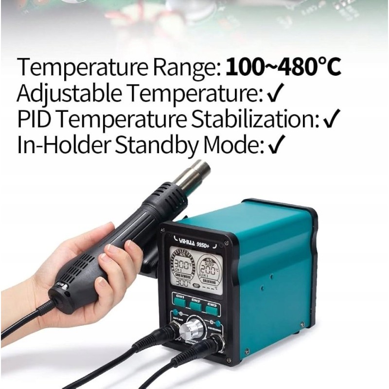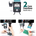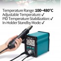 - Ten produkt łączy wydajną stację lutowniczą o mocy 110 W z jednostką do gorącego powietrza. Teraz możesz wykonywać lutowanie, rozlutowywanie i przetwarzanie na gorącym powietrzu za pomocą jednego urządzenia. Oba są wyposażone w regulowaną temperaturę: lutownica 200~480°C, stacja do gorącego powietrza 100~480°C wraz z regulacją objętości powietrza.