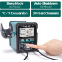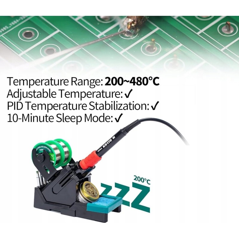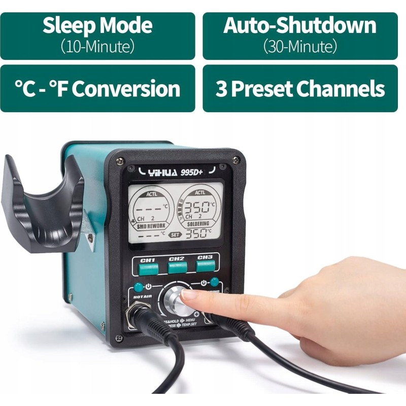 - Integrowane funkcje obejmują precyzyjną regulację temperatury PID zarówno dla lutownicy, jak i pistoletu do gorącego powietrza, 3 zaprogramowane kanały, tryb uśpienia, automatyczne wyłączanie, przelicznik °C-°F i kalibrację temperatury.