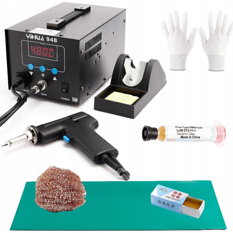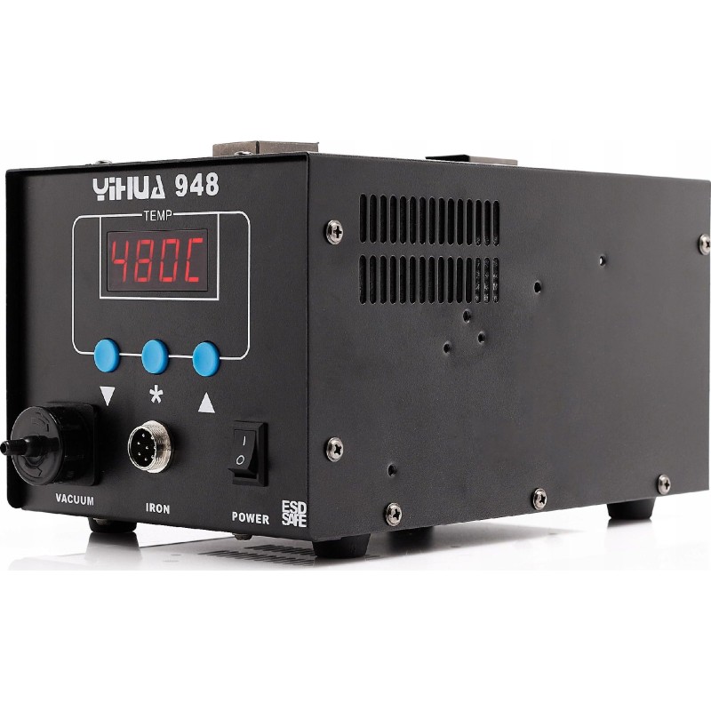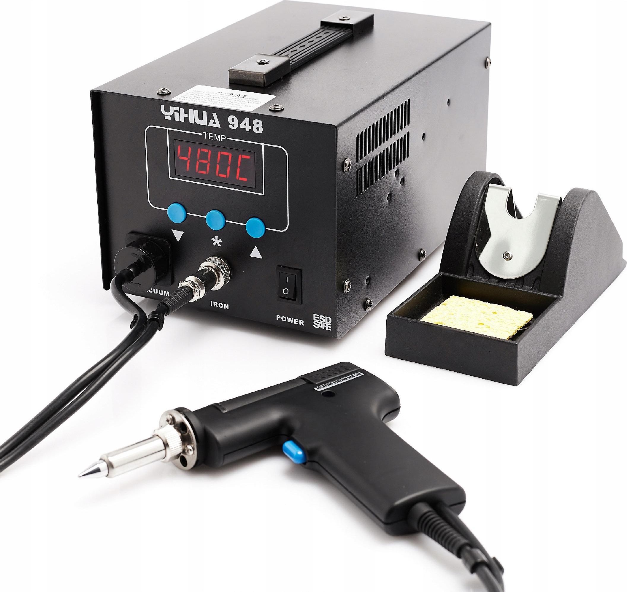 Stacja lutownicza Yihua 948 wraz z rozlutownicą do cyny. Dzięki wydajnym elementom grzejnym pozwala szybko i wygodnie lutować / wylutowywać wszystkie elementy elektroniczne.
