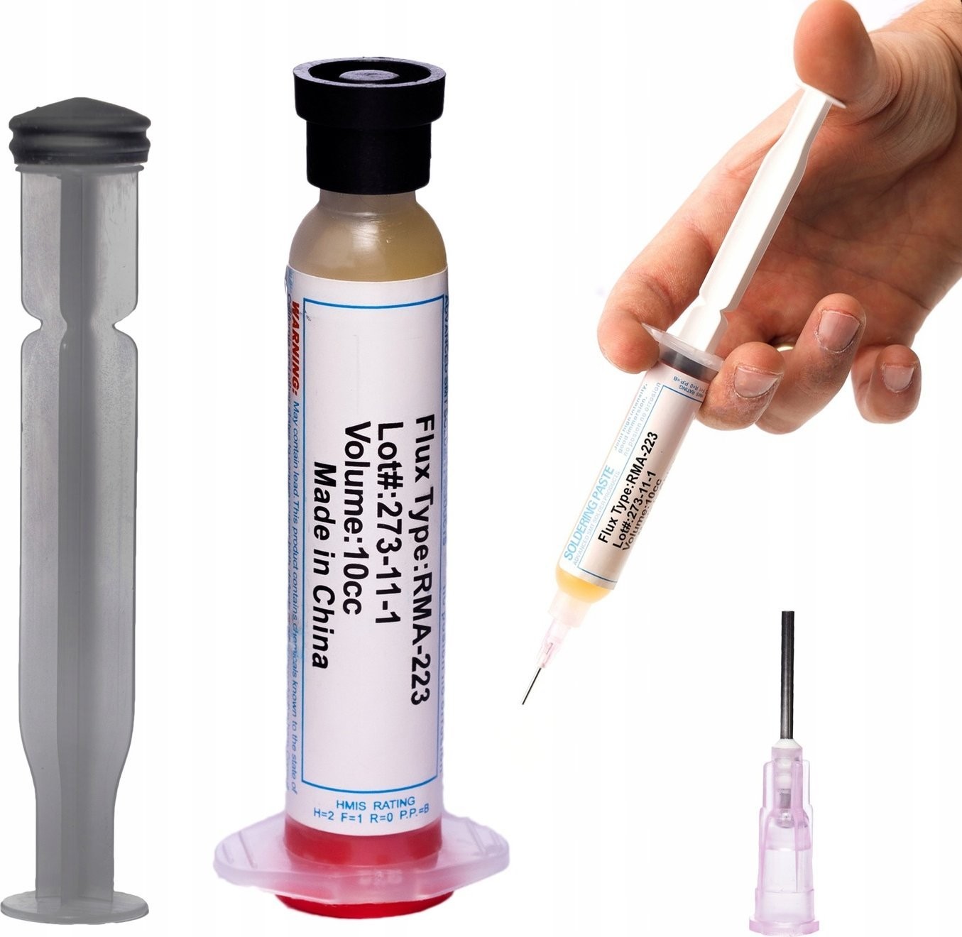 9️⃣ Topnik flux lutowniczy RMA-223 z tłoczkiem i igłą.