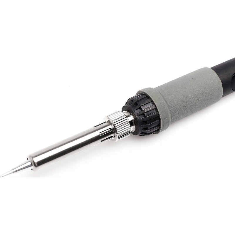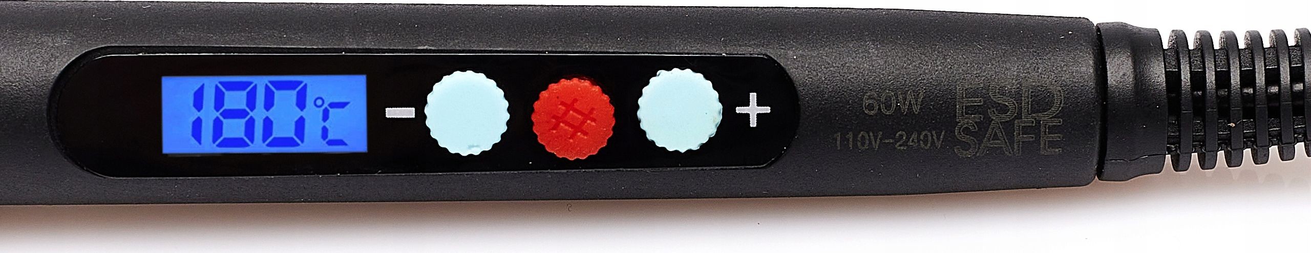 Profesjonalna, mocna i precyzyjna lutownica 60W z możliwością dostosowywania temperatury w zakresie 180 °C - 500 °C, przenośne urządzenie z dokładnym wyświetlaczem, bardzo szybko nagrzewające się do zadanej temperatury. Lutownica posiada stabilizacje temperatury, czyli utrzymanie zadanej temperatury podczas lutowania.
