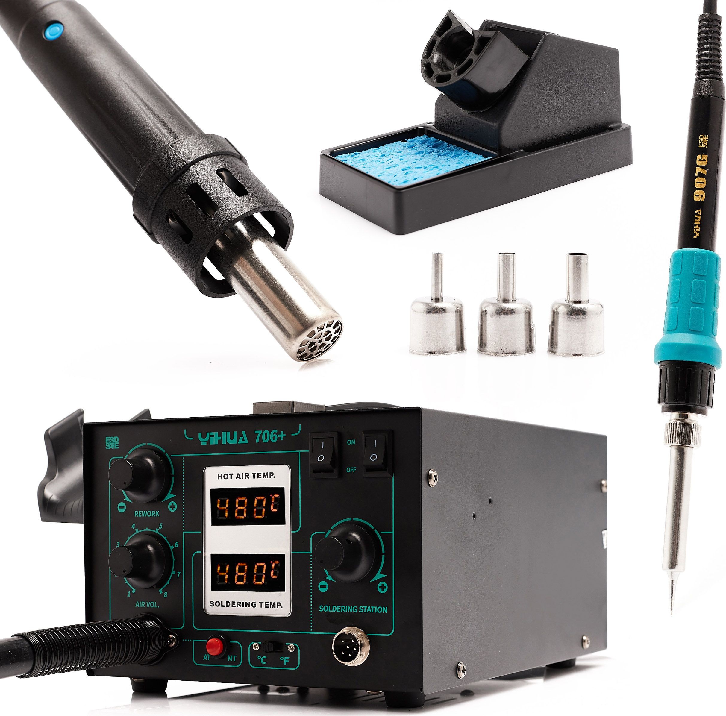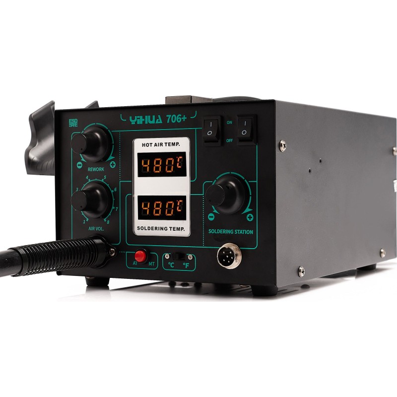 SpecyfikacjaYihua 706+ charakteryzuje się wysoką mocą szczytową 640W oraz maksymalnym poborem 700W. Posiada dwa wyświetlacze, które pokazują rzeczywistą temperaturę dla obu systemów. Urządzenie zapewnia największy przepływ powietrza na rynku wynoszący 168 l/min, co umożliwia efektywne chłodzenie i lutowanie.