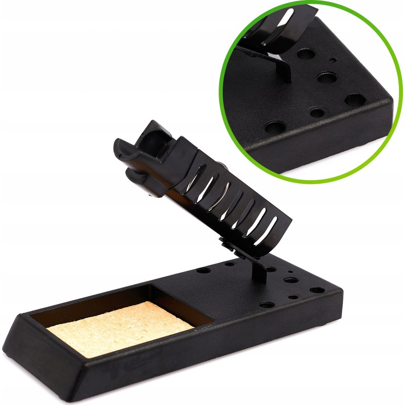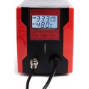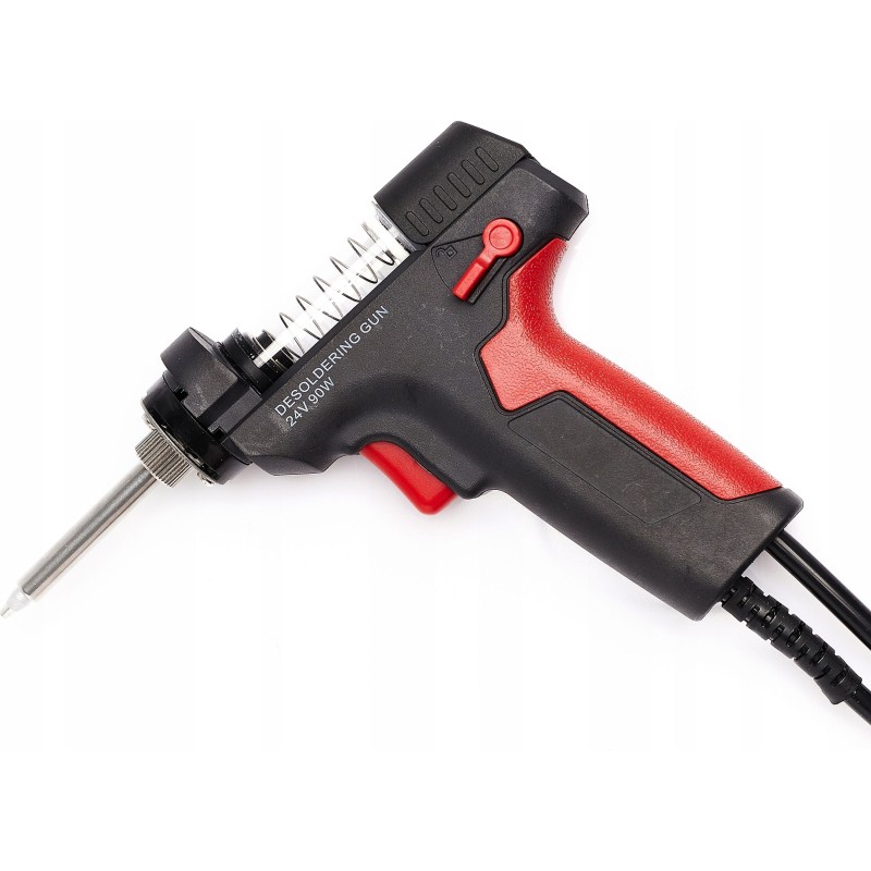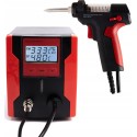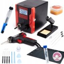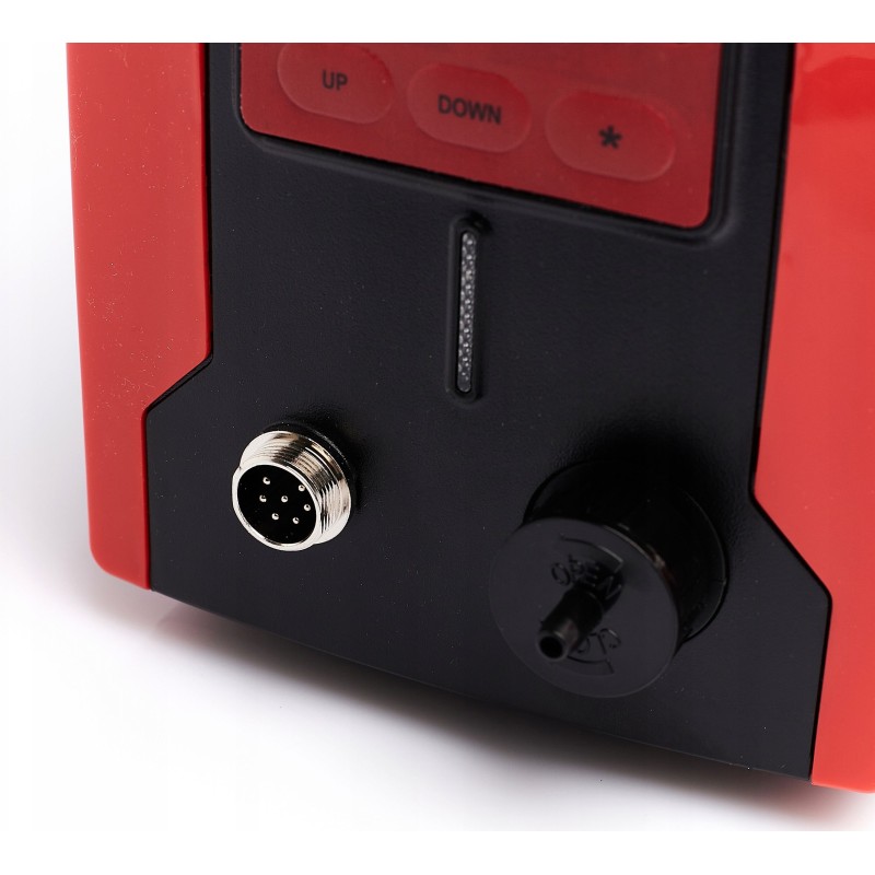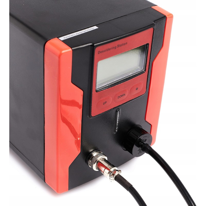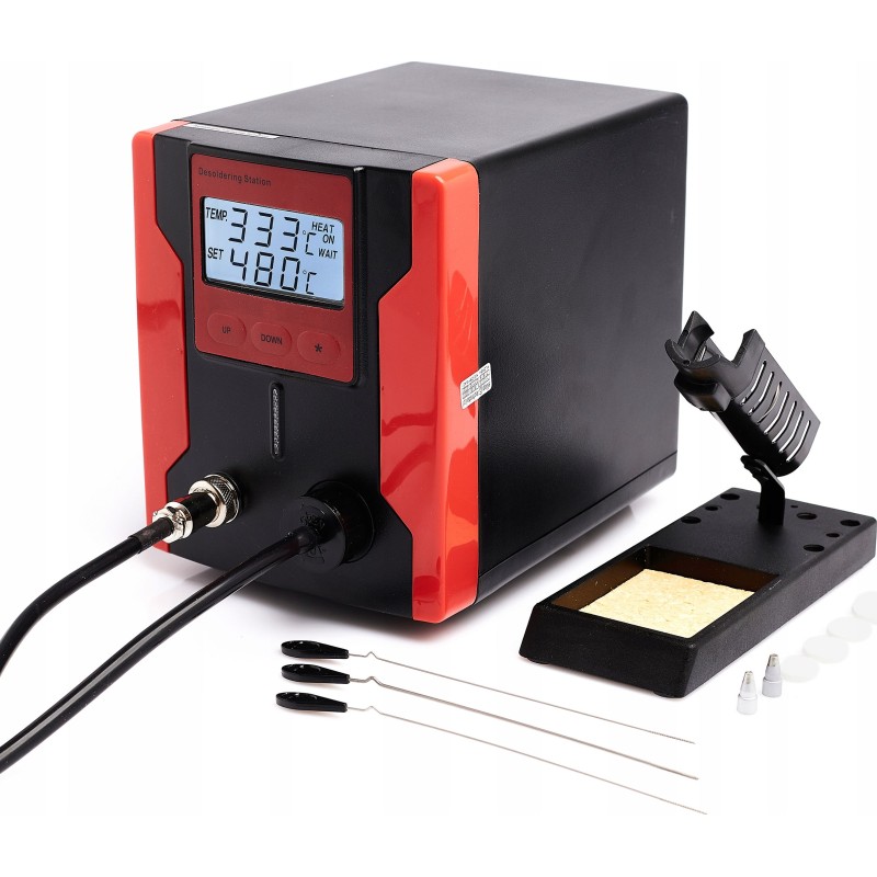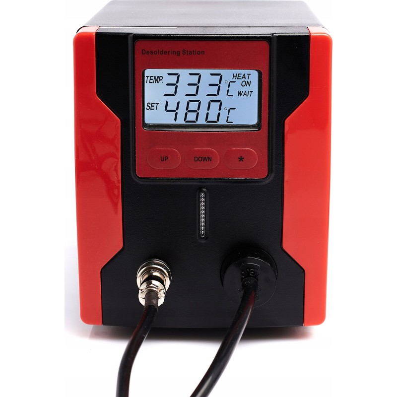 Stacja lutownicza służąca do demontażu elementów elektronicznych z płytek drukowanych PCB. Stacja z wbudowanym wewnętrznym kompresorem, który po naciśnięciu spustu pistoletu uruchamia się wytwarzając podciśnienie. W porównaniu do zwykłych odsysaczy jest wygodniejsza, oraz pozwala na szybszą pracę - sama podgrzewa cyne. Jednostka centralna wyposażona została w duży i czytelny wyświetlacz LCD z podświetlenie, który ukazuję zadną wartość temperatury, oraz temperaturę zmierzoną (odczytaną) z grotu lutownicy. Temperatura regulowana jest ze skokiem 1°C w zakresie od 160°C do 480°C. Stacja wyposażona w funkcje sleep, czyli funkcje, która przedłuża żywotność grzałki, gdy pistolet nie jest używany przez 15 minut kolba automatycznie zaczyna wychładzanie do 200°C, gdy tylko kolba zostanie podniesiona następuje ponowne nagrzewanie do zadanej temperatury. Wydajna grzałka o mocy 90W poradzi sobie w wielu trudnych wypadkach. Stacja wykonana z wysokiej klasy materiałów, w czerwonym kolorze prezentuje się fenomenalnie.