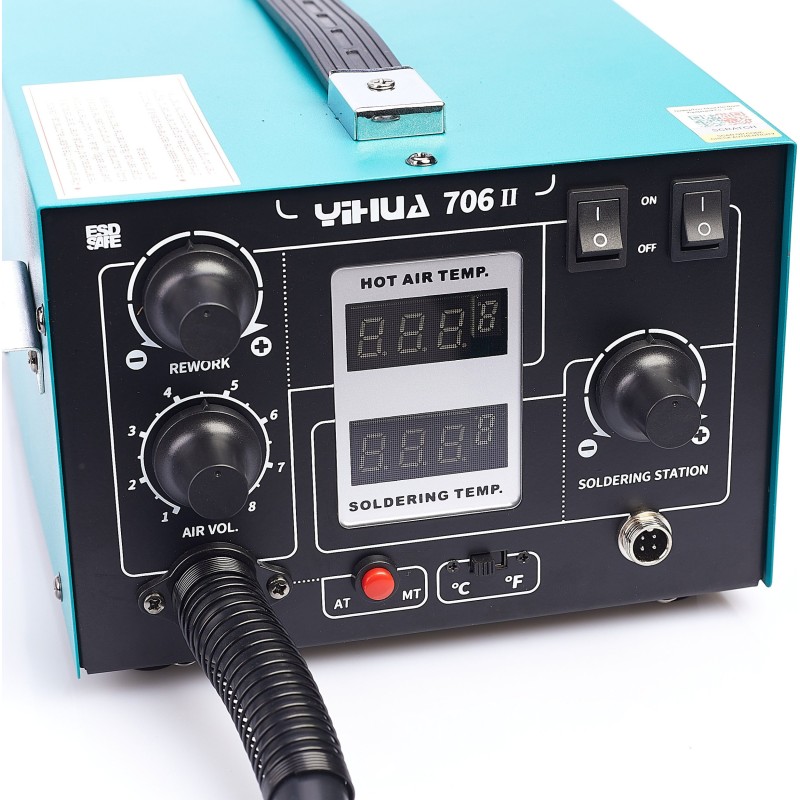 Innowacyjna stacja lutownicza 2w1 Hot-Air + system T12 Yihua 706 II + zestaw 3 dysz + podkładka anty-oparzeniowa i topnik