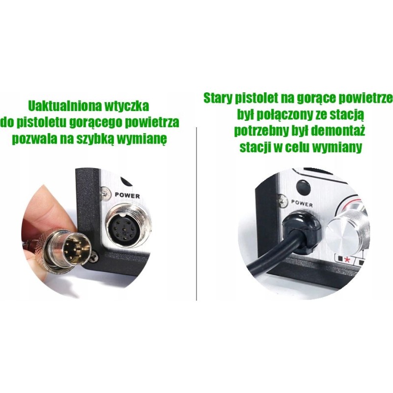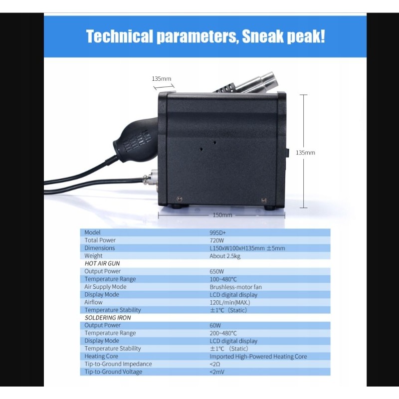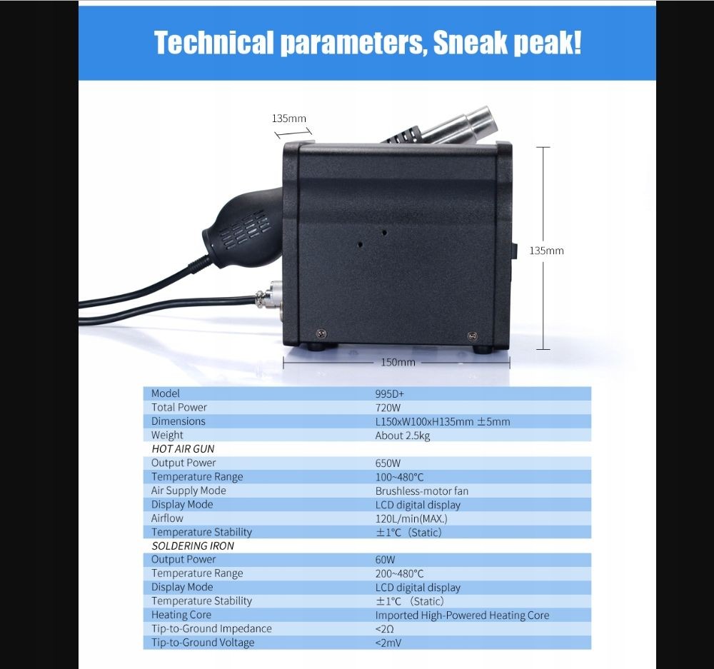 Najnowszy model stacji lutowniczej 2w1, urządzenie sprawdzi się do profesjonalnych warsztatów jak i dla hobbistów. W porównaniu ze starą wersją posiada odpinaną kolbę gorącego powietrza oraz pamięć trzech temperatur. Zamieniona została również podstawka do lutownicy, wyposażona jest teraz w gąbkę, czyścik z wiórkami do czyszczenia grotów, kalafonię, miejsce na zapasowe groty oraz uchwyt na szpulę cyny, nowa podstawka jest również bardziej stabilna, przez co jest bardziej wygodna w użyciu, oraz charakteryzuję się nowoczesnym designem.