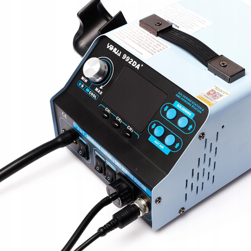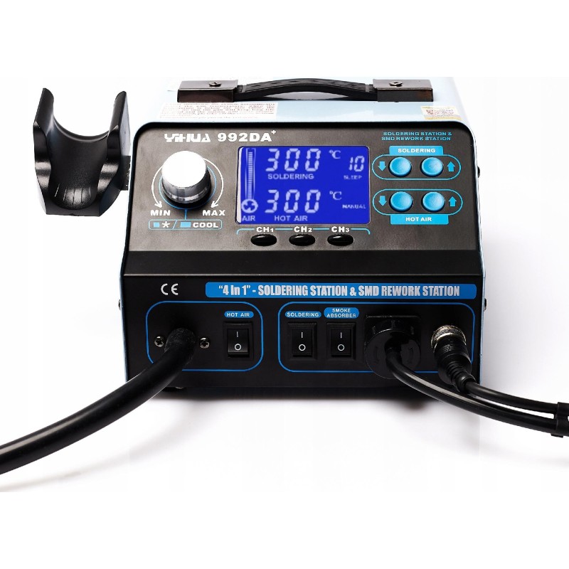 Urządzenie Yihua 992DA+ to stacja lutownicza na gorące powietrze (hotair) oraz lutownica grotowa (75 W), wykorzystywana jest do lutowania i rozlutowania elementów elektronicznych. Stacja wyposażona jest w mikroprocesor z precyzyjnym regulatorem PID, który sprawdza parametry pracy i koryguje je do zadanych wartości.