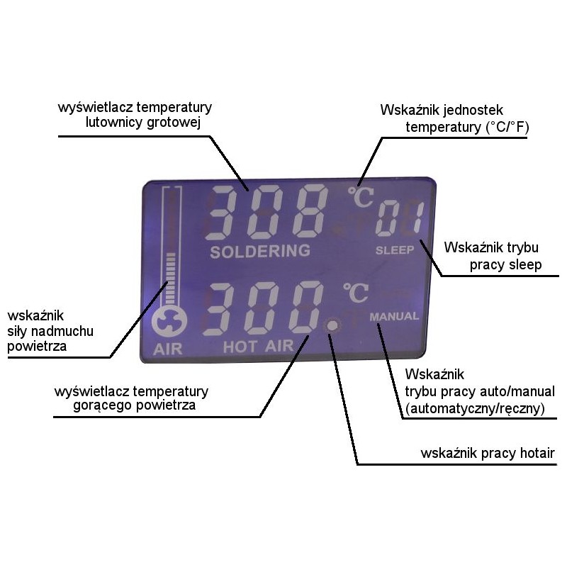 Wartości temperatur, mocy przepływu powietrza, tryb pracy, są widoczne na dużym czytelnym wyświetlaczu LCD, co znacznie ułatwia prace.
