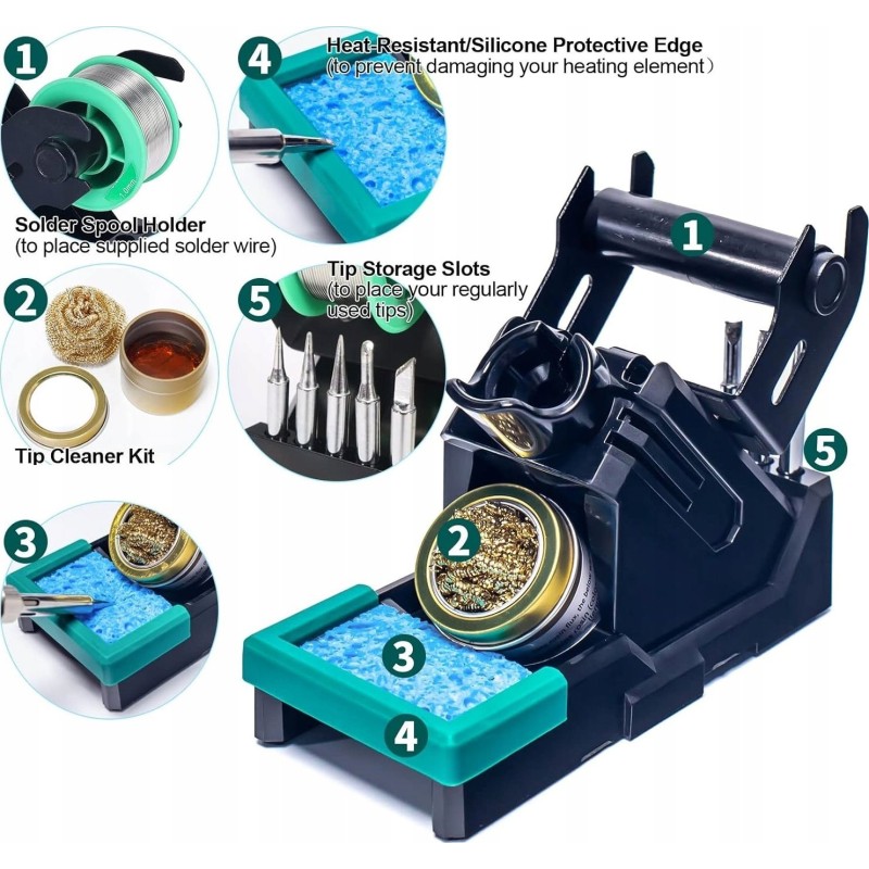 Obejmuje stojak do lutownicy, zestaw do czyszczenia, półkę ochronną, tymczasowe przegródki na groty lutownicze i uchwyt na szpulę lutowniczą w stabilnym uchwycie, zapewniając porządek i zwiększając bezpieczeństwo pracy.