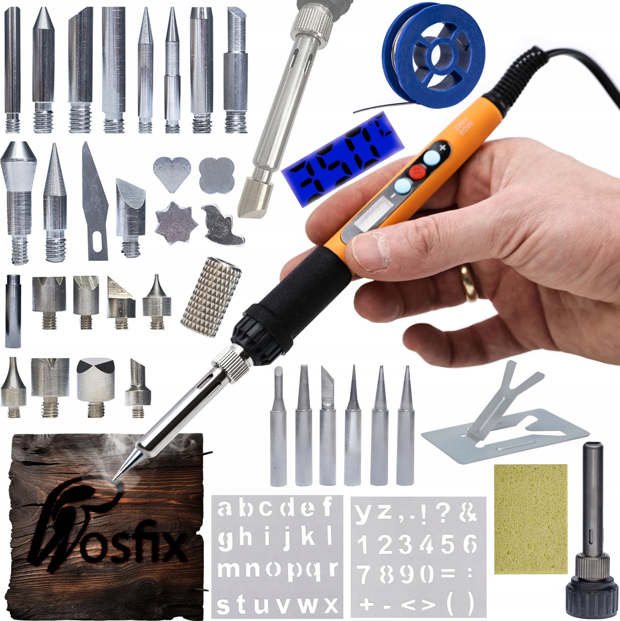 Zestaw 11w1 profesjonalna lutownica precyzyjna z wyświetlaczem Rosfix Orange Rottweiler Seria Electric S (Lutownica, 6 grotów, gąbka, cyna i podstawka) + 30 elementów do wypalania drewna ( 27 grotów, adapter 900M , 2 szablony)