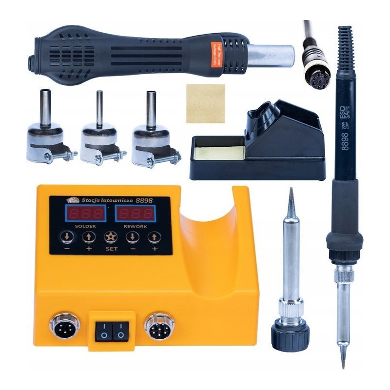 1️⃣ Stacja lutownicza 2w1 Rosfix Orange Husky OH660: To główne narzędzie, które zawiera moduł lutownicy na gorące powietrze oraz moduł grotowy o mocy 60W.