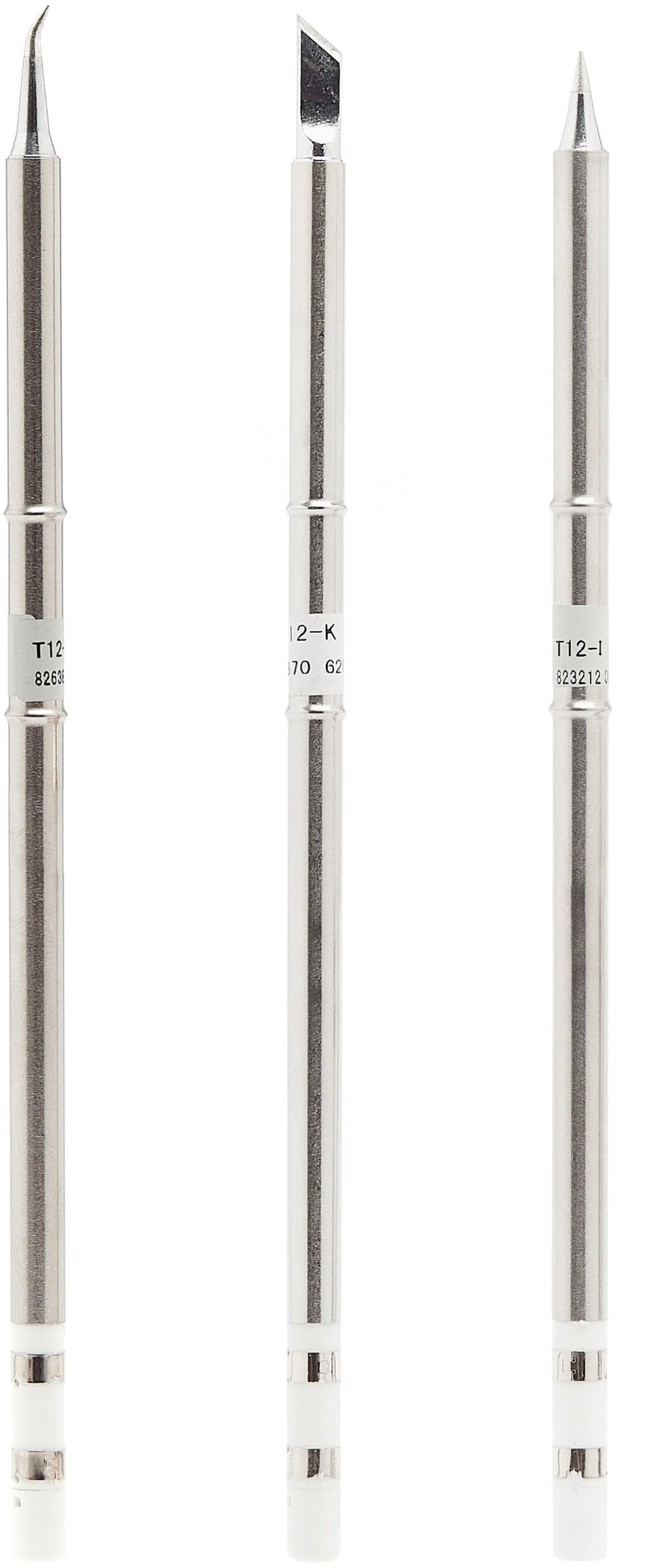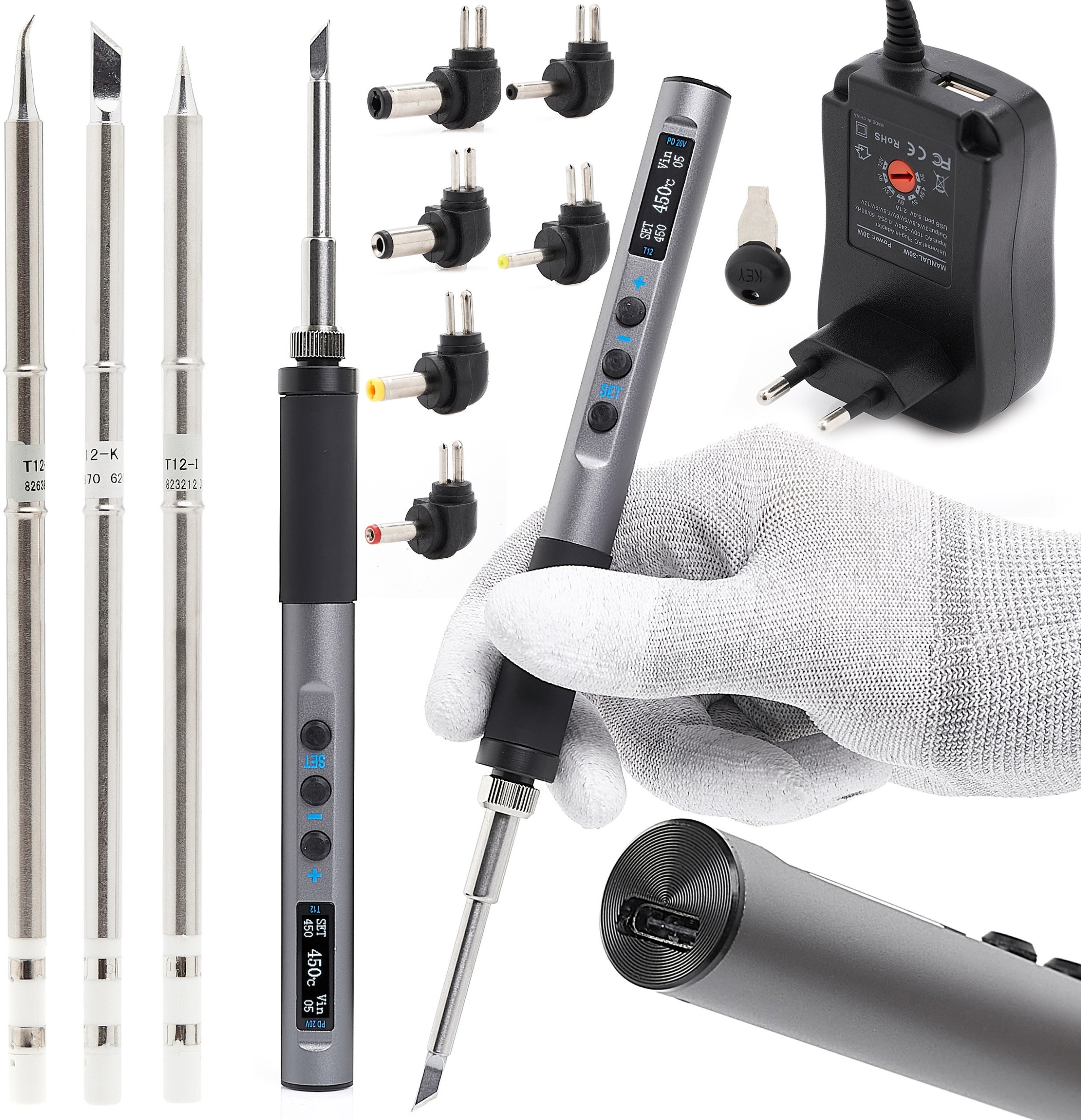 W zestawie znajdują się trzy groty T12, które można łatwo wymieniać bez użycia specjalnych narzędzi. Lutownica jest wszechstronnym narzędziem, które sprawdzi się w naprawach urządzeń elektronicznych, tworzeniu modeli DIY, pirografii oraz lutowaniu materiałów syntetycznych.