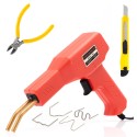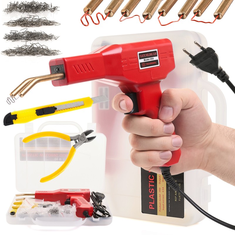 W zestawie znajduje się zszywacz do plastiku H50, który umożliwia szybkie naprawy elementów plastikowych. Zszywacz dostarczany jest z 200 zszywkami o różnych kształtach, co pozwala na dostosowanie narzędzia do różnych zastosowań.