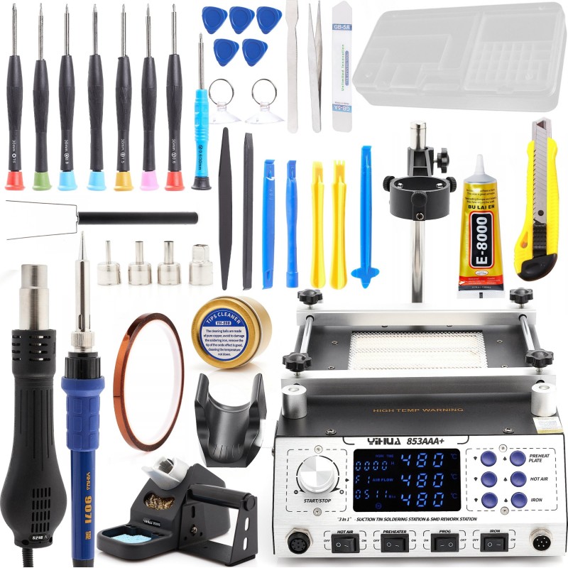 Stacja lutownicza 3w1 Yihua 853AAA+ + Zestaw narzędzi do naprawy elektroniki GSM 25w1 + podwójny box + klej E-8000 110ml + nóż + kapton