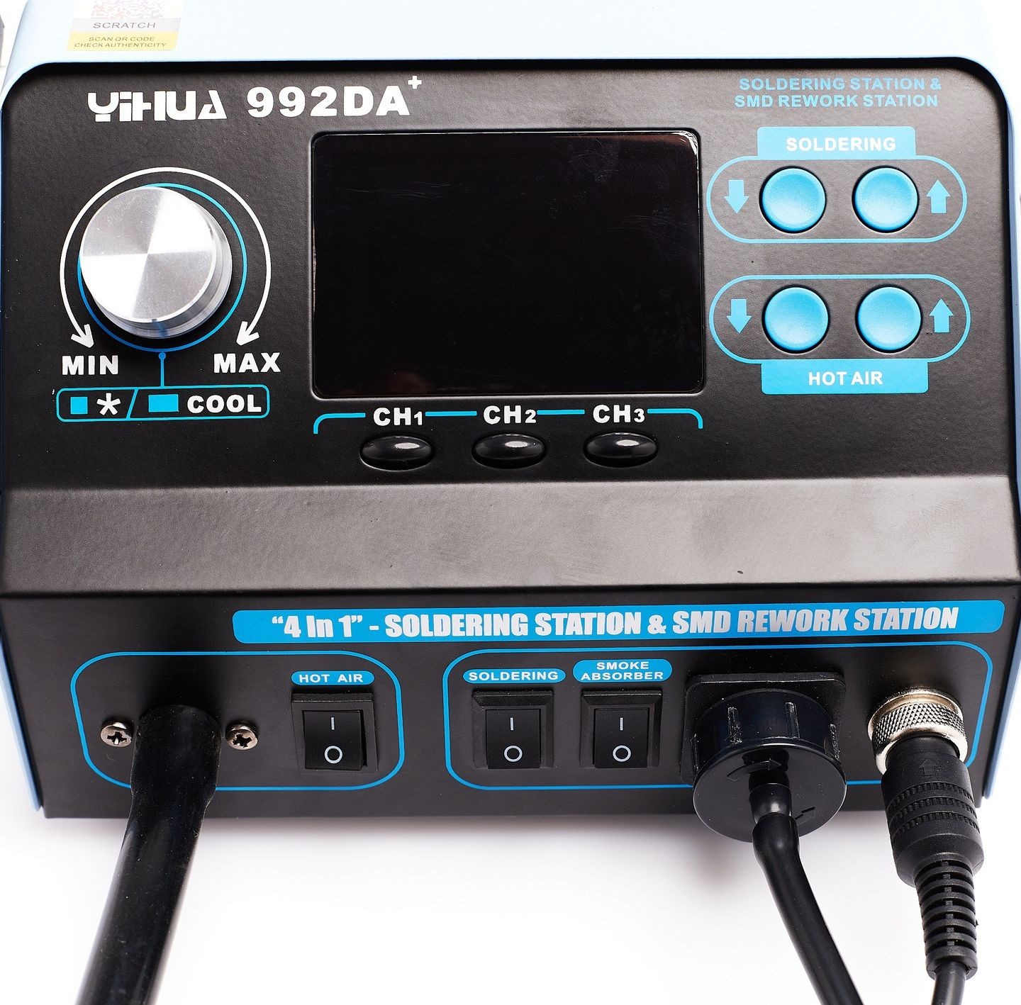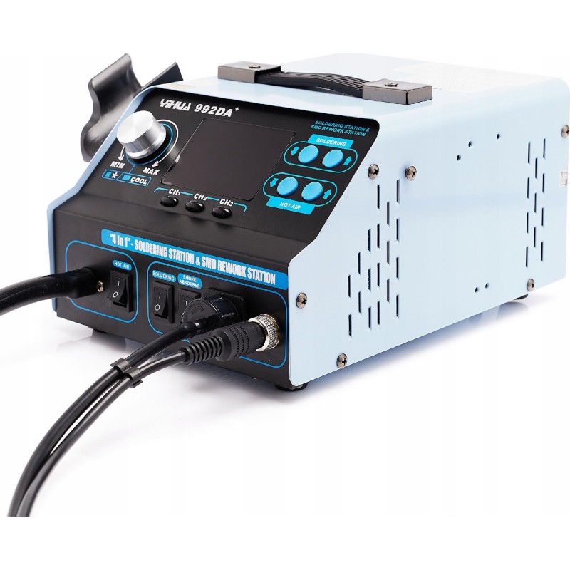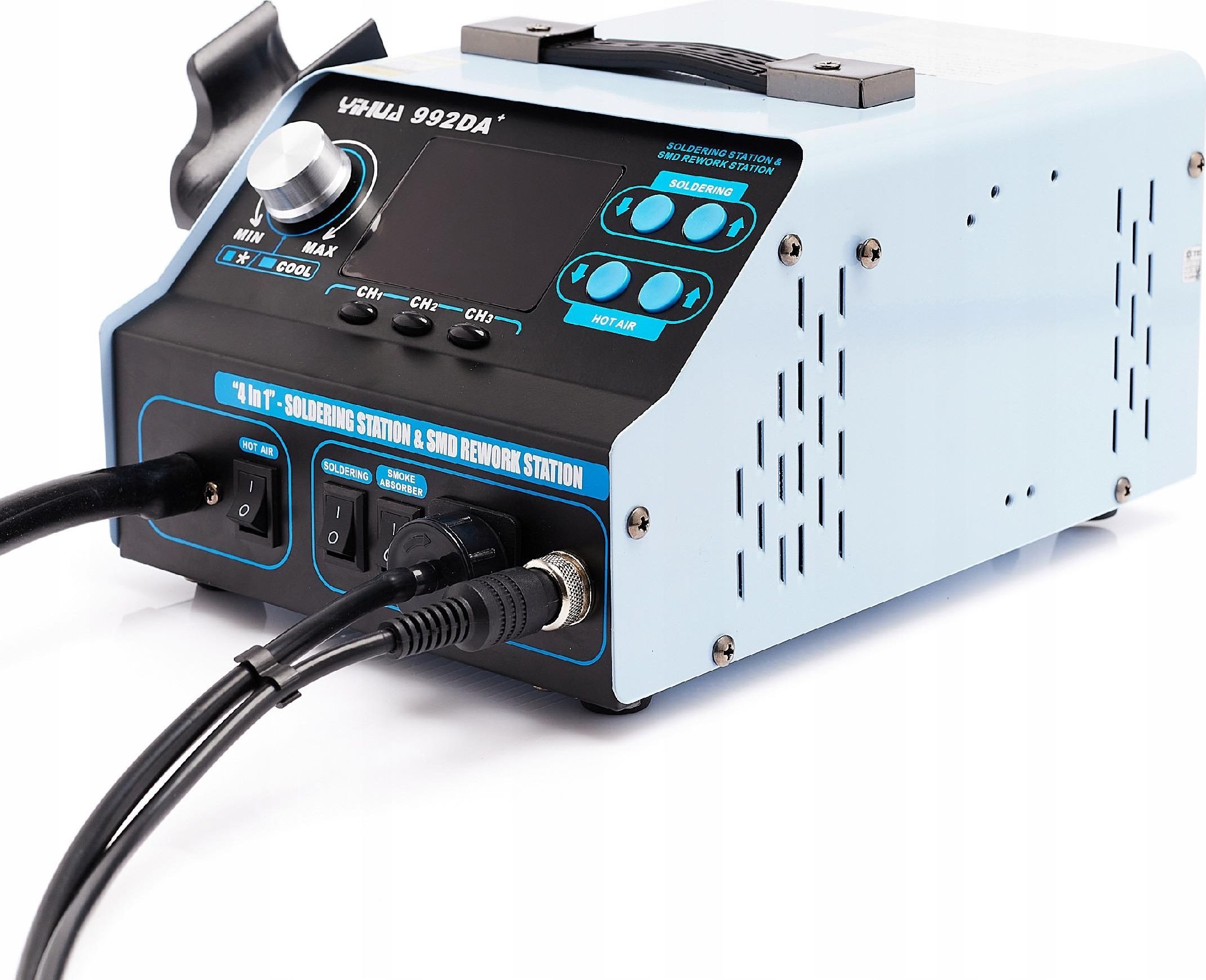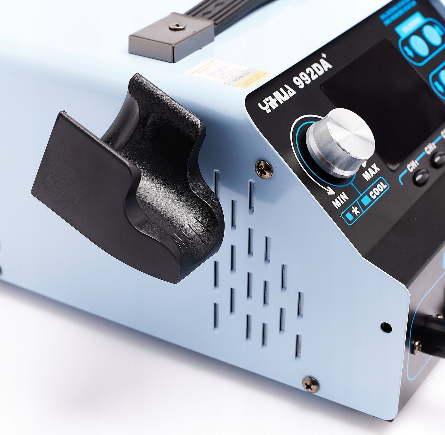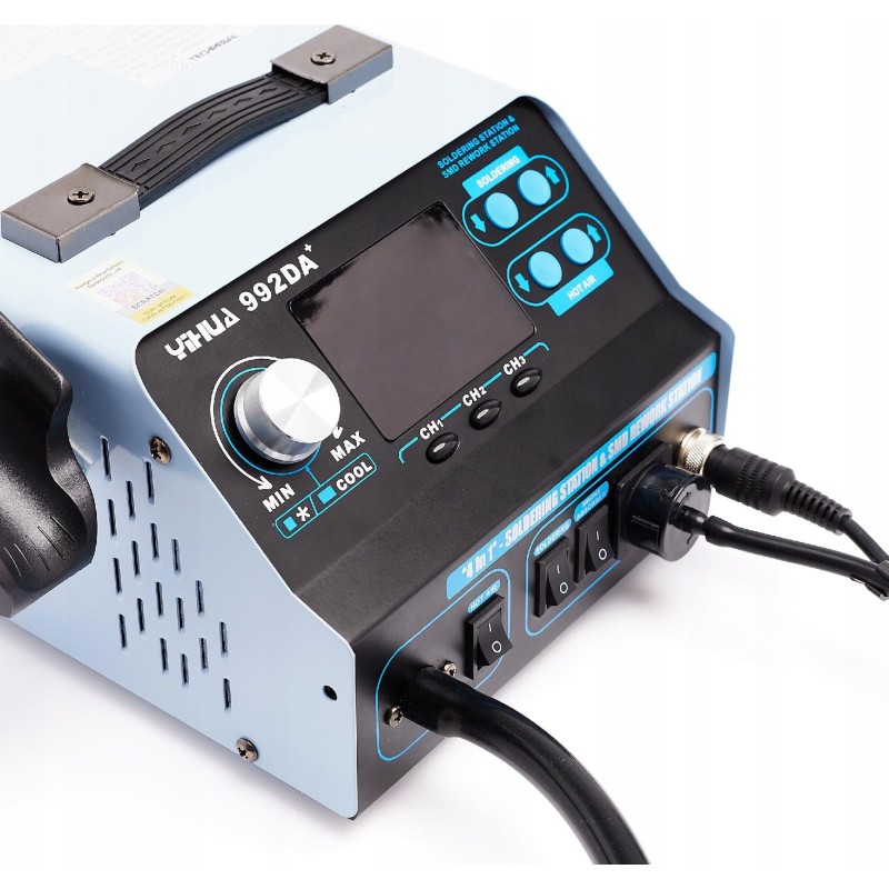 Urządzenie Yihua 992DA+ to stacja lutownicza na gorące powietrze (hotair) oraz lutownica grotowa (75 W), wykorzystywana jest do lutowania i rozlutowania elementów elektronicznych. Stacja wyposażona jest w mikroprocesor z precyzyjnym regulatorem PID, który sprawdza parametry pracy i koryguje je do zadanych wartości.