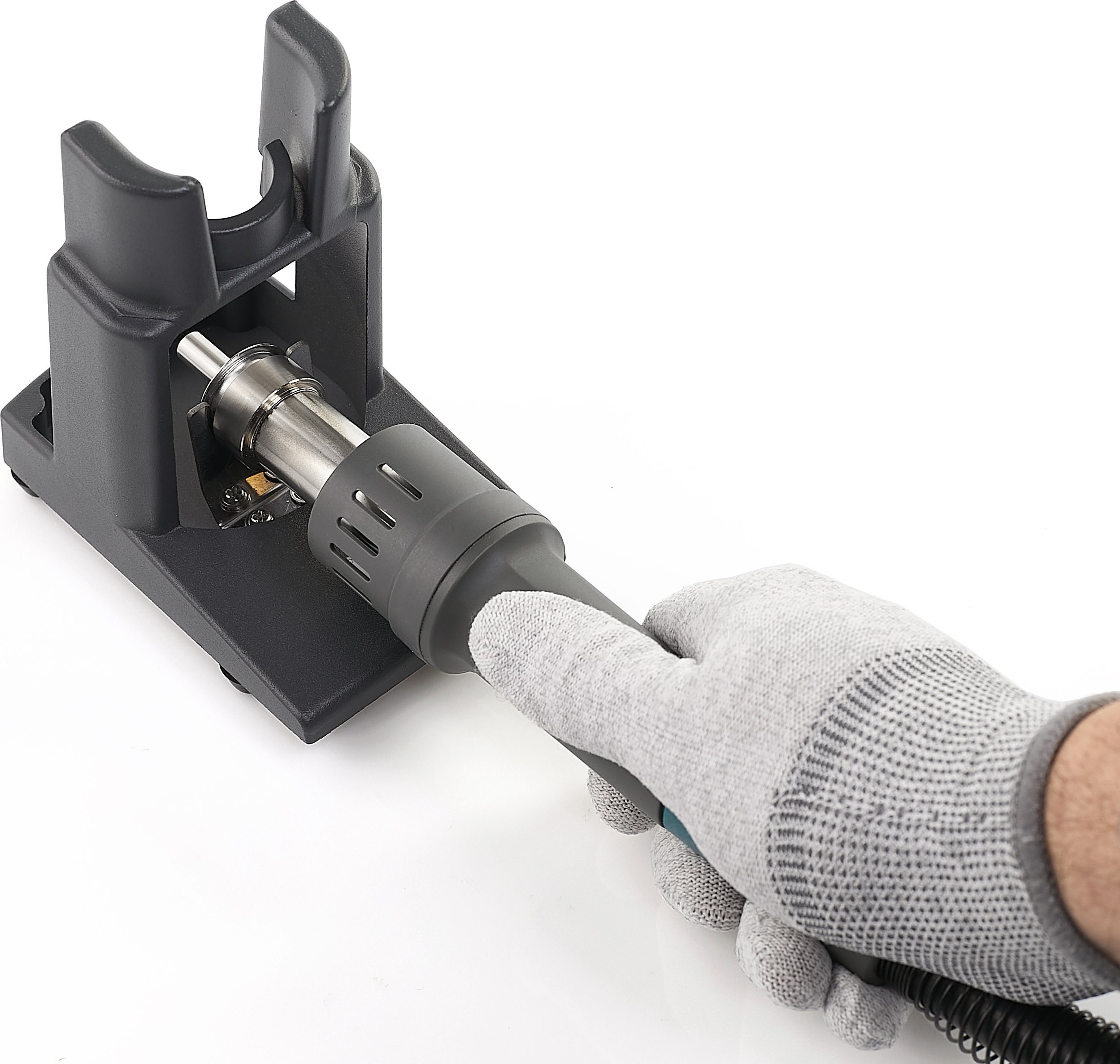 Wytrzymała grzałka szybko osiąga ustawioną temperaturę, zapewniając efektywność pracy. Dzięki temu, żywotność grzałki jest znacznie wydłużona. Po ponownym użyciu kolby, urządzenie błyskawicznie wraca do poprzednio ustawionej temperatury. Bezpieczeństwo ustawień gwarantuje blokada hasłem oraz funkcja zabezpieczająca przed przypadkowym naciśnięciem przycisków. Urządzenie oferuje także szeroki zakres regulacji przepływu powietrza dzięki zastosowaniu silnika bezszczotkowego oraz jest wykonane w technologii antystatycznej (ESD Safe), co świadczy o jego wysokiej jakości.