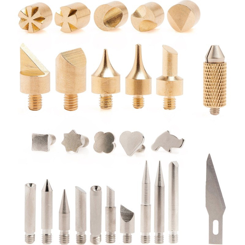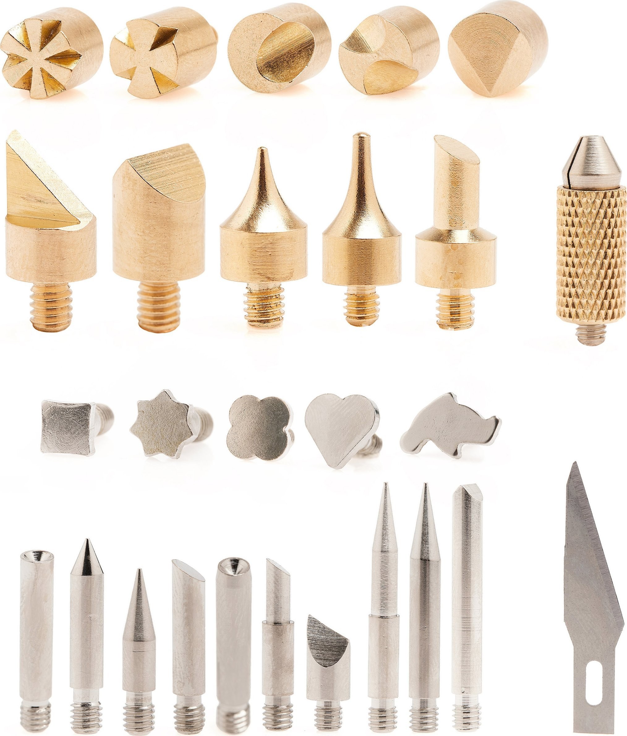 - W zestawie znajduje się kompletny zestaw 46 końcówek do wypalania oraz śrubokręt do ich wymiany.