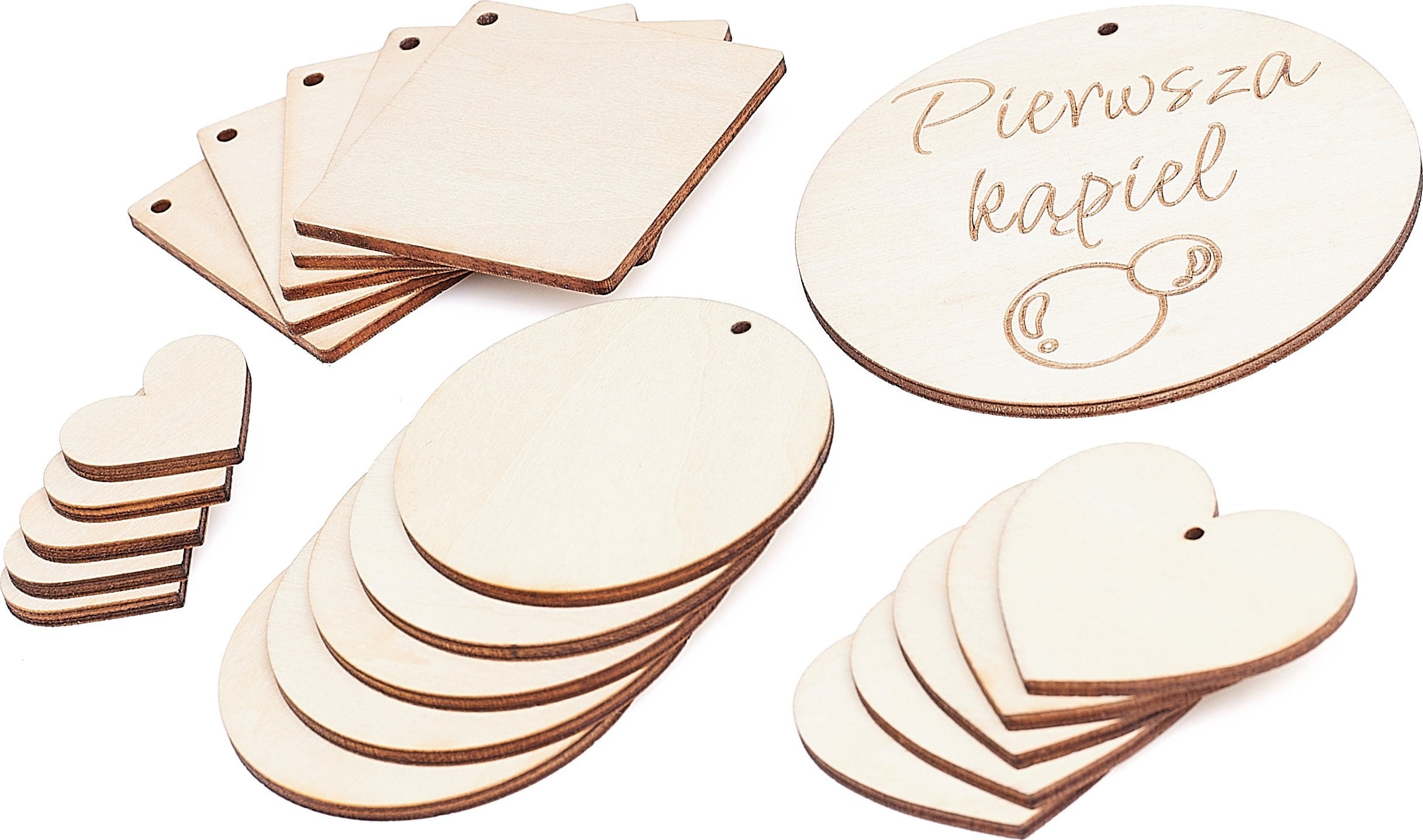 Zestaw 20 sklejek w różnych kształtach do wypalania za pomocą wypalarki do drewna.