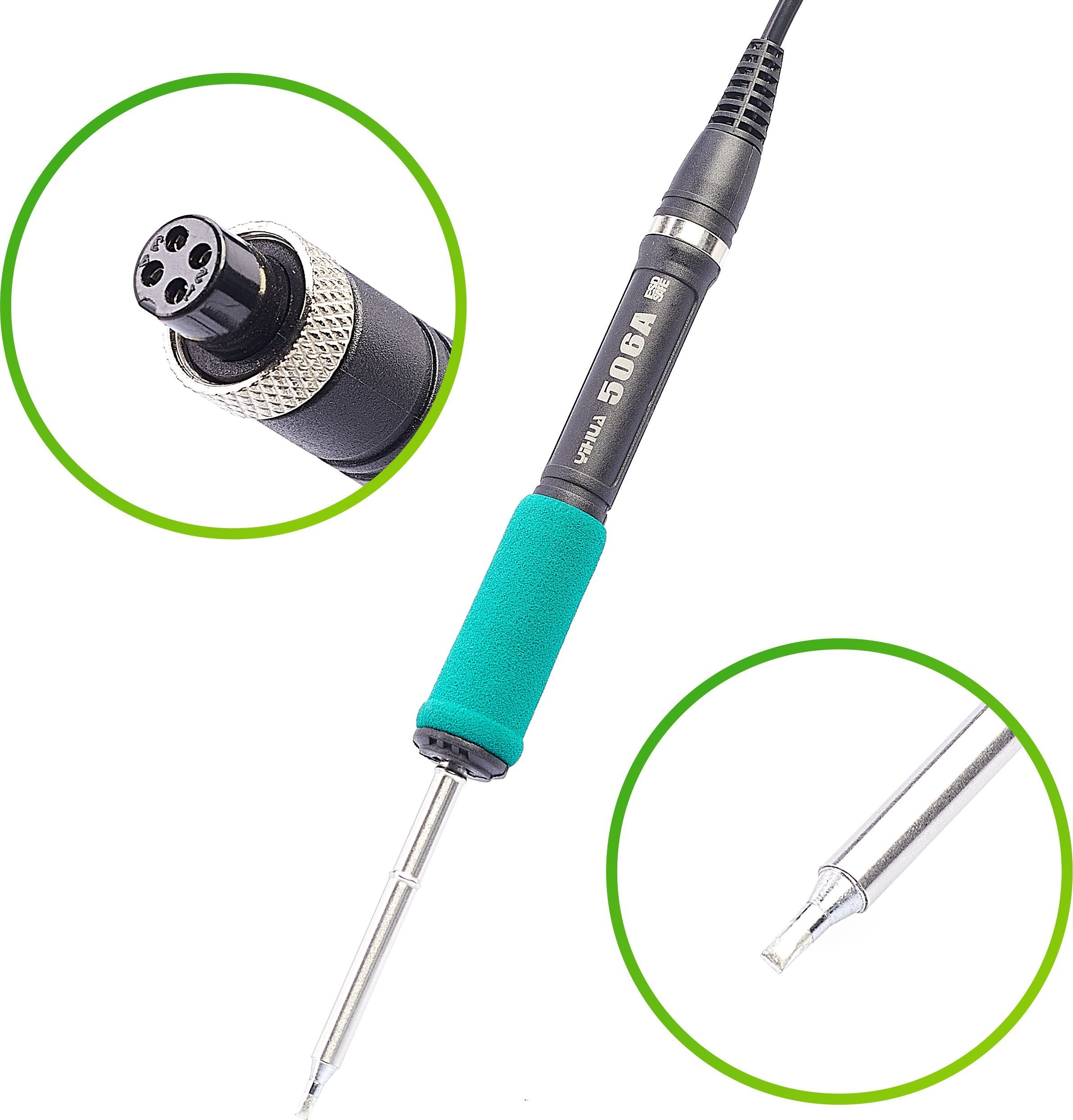 ✅ System szybkiej wymiany grotów T12(Kolba 506A) Jednym z głównych atutów tej stacji lutowniczej jest system szybkiej wymiany grotów T12. Dzięki temu można łatwo i szybko zmieniać groty, co umożliwia dostosowanie lutownicy do różnych zadań i rodzajów lutowania.
