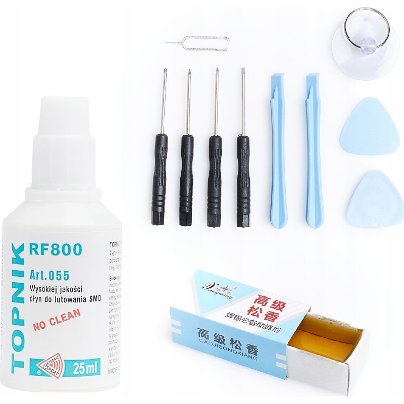 W tym zestawie otrzymujesz niezbędne akcesoria do lutowania. Dostajesz do dyspozycji zestaw 10 szt. narzędzi, kalafonie oraz topnik RF800.