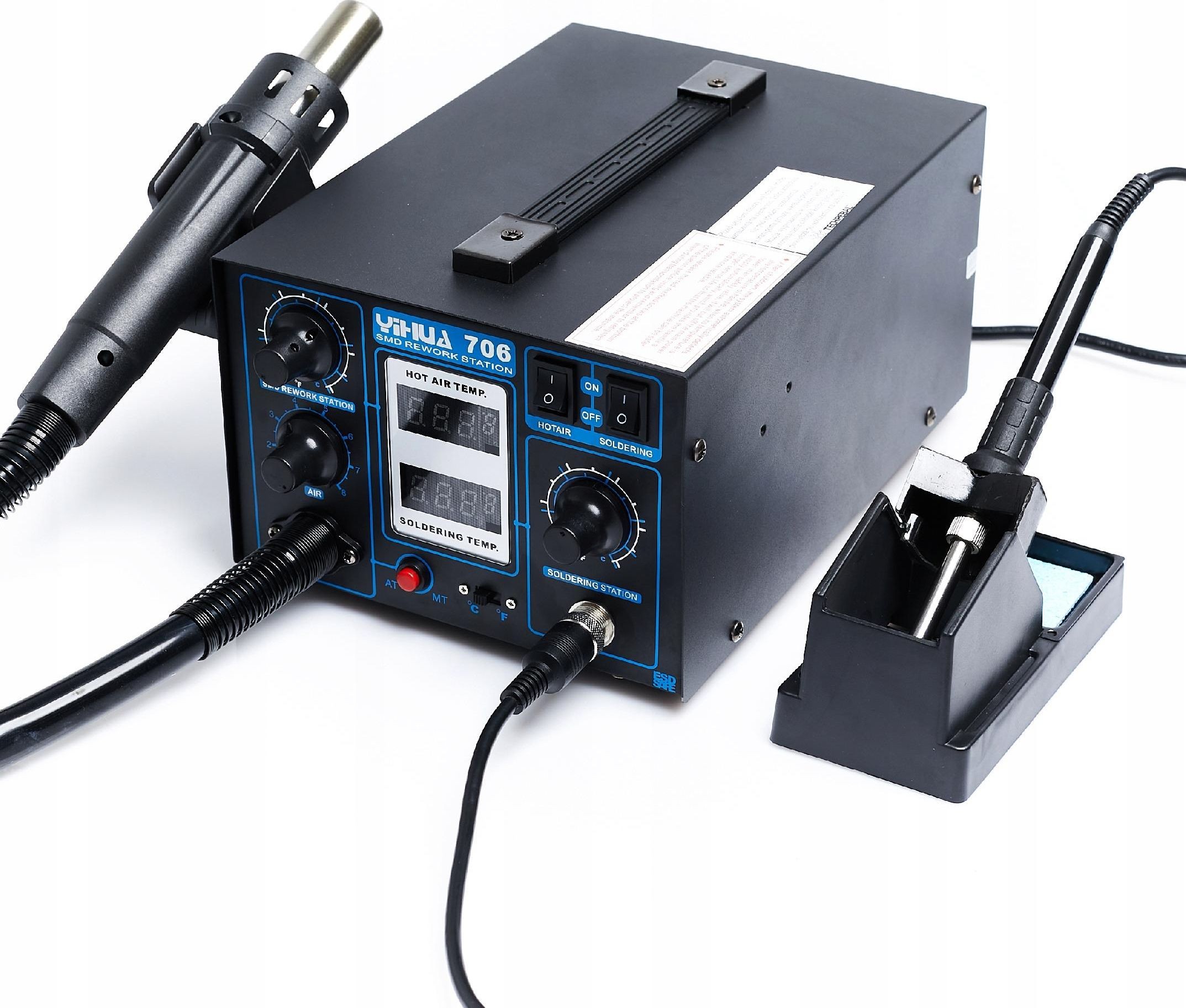 Najnowszy model stacji lutowniczej, Yihua 706 wykorzystuje wiele nowinek technicznych,korzysta z systemu kontroli temperatury Samsung do szybkiego reagowania w czasie rzeczywistym, posiada regulator obu systemów, zarówno lutownicy jak i gorącego powietrza. Stacja 706 to przede wszystkim niespotykana jakość widoczna gołym okiem, urządzenie uniwersalne zarówno dla wymagających jak i średnio zaawansowanych użytkowników w produkcji elektroniki i jej naprawie. Została wyposażona w nowy system nawiewu Hot-Air , dzięki czemu zapewnia on większą elastyczność oraz siłę nadmuchu, zwłaszcza podczas użytkowania dysz z małym otworem, gdzie odprowadzenie ciepła i przepływu jest utrudnione, zastosowanie tych technologi zapewnia dłuższą żywotność i efektywność naszej pracy. Kolba wyposażona jest w specjalnie silikonowe przewody odporne na działanie wysokich temperatur (nawet 300°C) W tym przedziale cenowym będzie to zapewne najlepsze rozwiązanie.