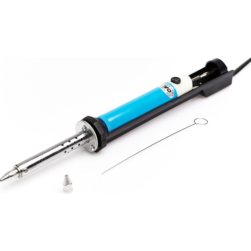 Elektryczny odsysacz do cyny z wyciorem i dodatkowym grotem Profesjonalny odsysacz lutowniczy, przeznaczony do usuwania cyny, urządzenie bardzo szybko rozgrzewa się do temperatury potrzebnej do pracy. Solidna konstrukcja pozwala na bardzo efektywną prace jedną reką. Bardzo przydatne urządzenie ułatwiające wylutowywanie elementów elektronicznych.