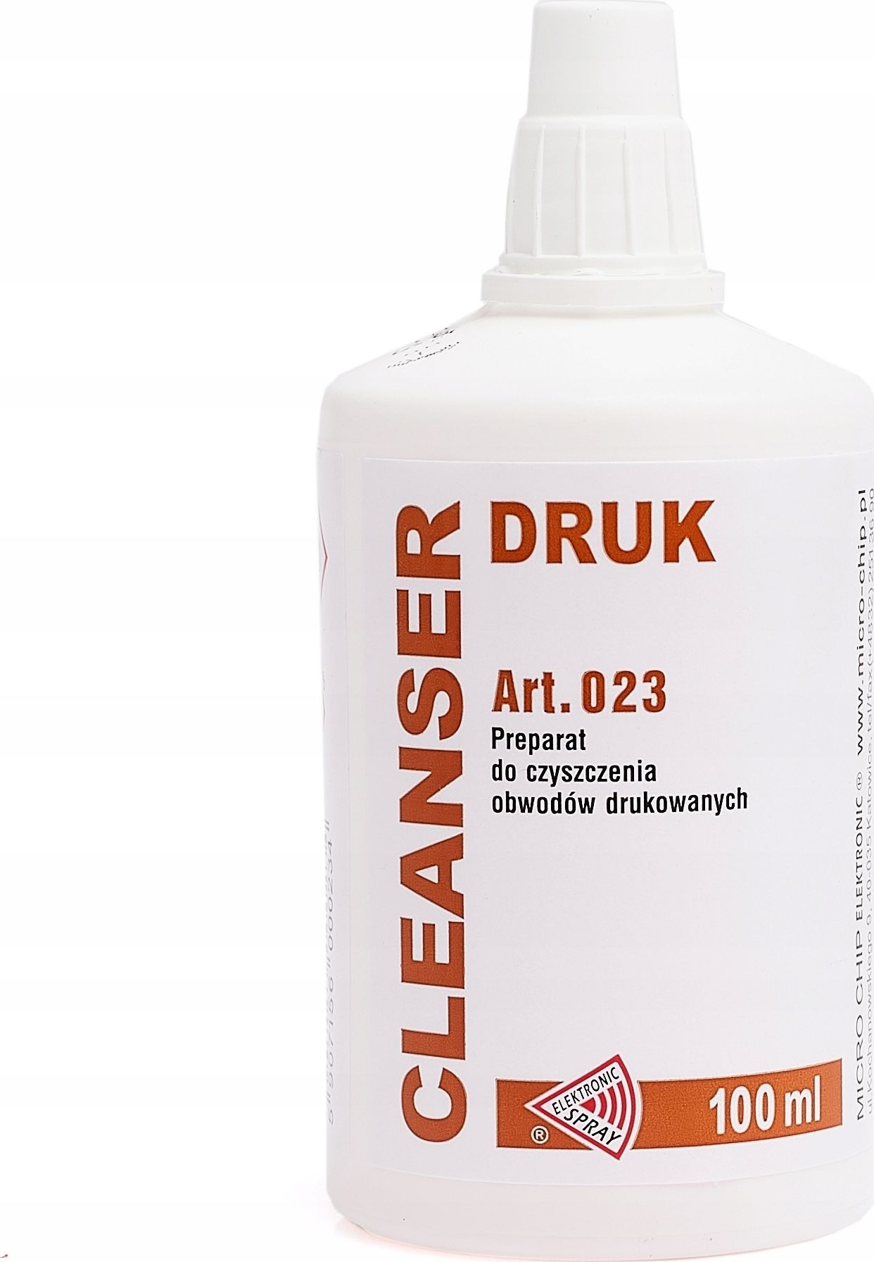 Cleanser Druk 100ml - Płyn do czyszczenia płytek drukowanych. Szybko i skutecznie usuwa pozostałości polutownicze oraz zanieczyszczenia powstałe na płytkach drukowanych podczas eksploatacji urządzeń. Nie pozostawia osadów, szybko odparowuje. Idealny do czyszczenia obwodów W.N. i w.cz. Niezastąpiony w każdym serwisie elektronicznym. Posiada lepsze parametry myjące niż izopropanol.