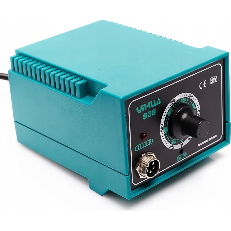 Stacja lutownicza w zestawie z kolbą 907A o bardzo dużej mocy szczytowej 60W, dzięki której można w niewielkim czasie nagrzać grot do pożądanej temperatury. Wyposażona jest również w zabezpieczenie - ESD SAFE które chroni ją przed przegrzaniem. 936 jako najbardziej niezawodny, sprawdzony model, idealny do zastosowania hobbistycznego, jak i małych serwisów, idealna stacja aby rozpocząć swoją przygodę z lutowaniem. Stacja z regulacją temperatury w zakresie od 200°C do 480°. Budowa stacji nie jest skomplikowana, dlatego też urządzenie jest praktycznie bezawaryjne. Stacja posiada stabilizacje temperatury, czyli utrzymanie zadanej temperatury podczas lutowania.