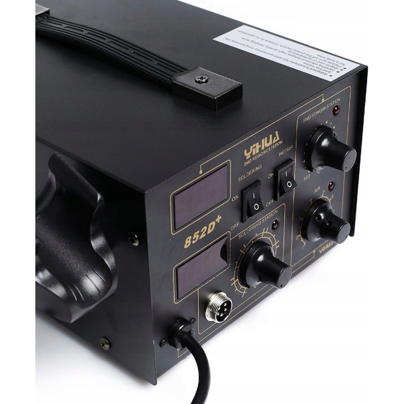 Stacja lutownicza Yihua 852D+ została wyposażona w mocny element grzejny gwarantujący szybkie nagrzewanie oraz trwałość grzałki. Posiada płynną regulacje nawiewu oraz temperatury. Stacja została zaprojektowana do prac lutowniczych z takimi komponentami jak układy SOIC, QFP, PLCC, BGA, SMD itd. Jak również nagrzewaniem, wygrzewaniem koszulek termokurczliwych, rozmrażaniem, rozpuszczaniem klejów, opalaniem farb, podgrzewaniem itp.