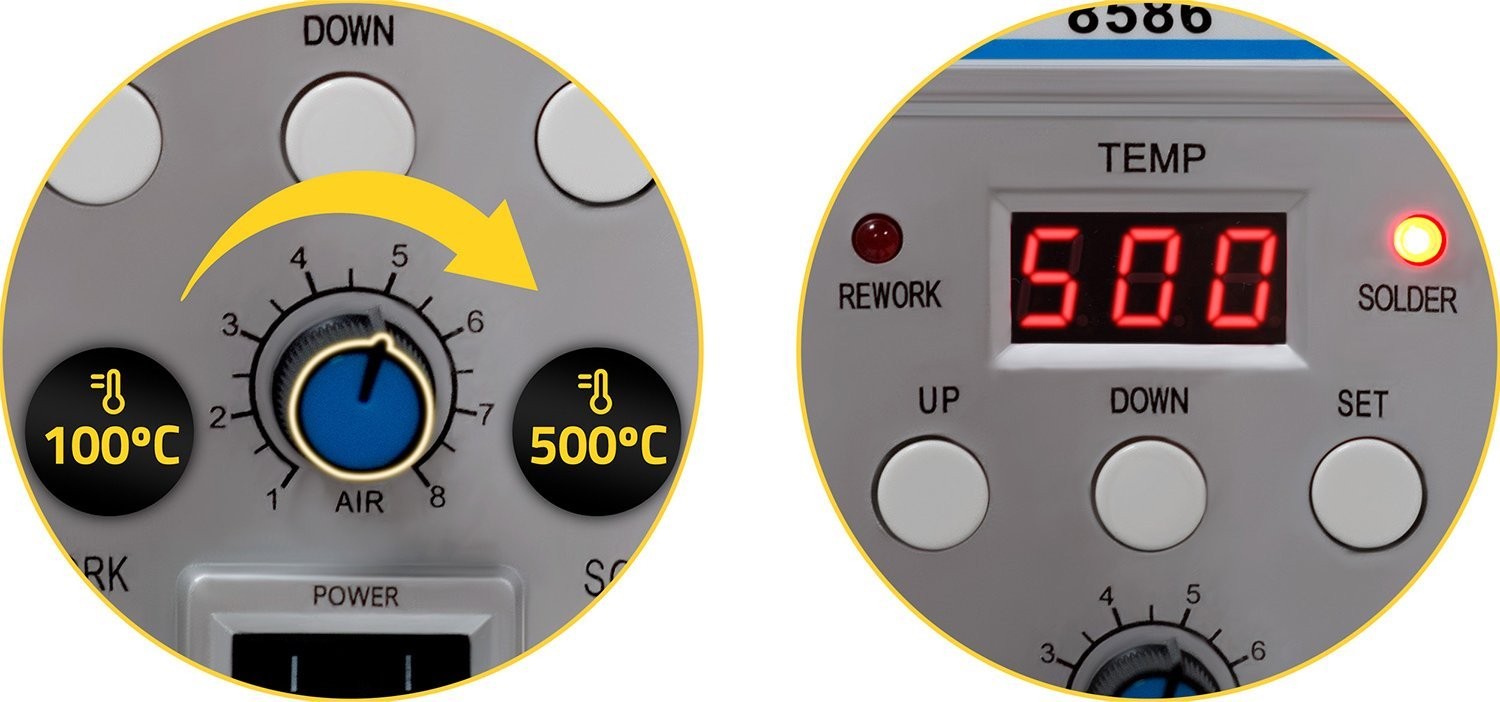 - Precyzyjna kontrola temperatury i przepływu powietrza: Możliwość regulacji temperatury w zakresie od 100 do 500°C oraz zmiany natężenia nadmuchu.