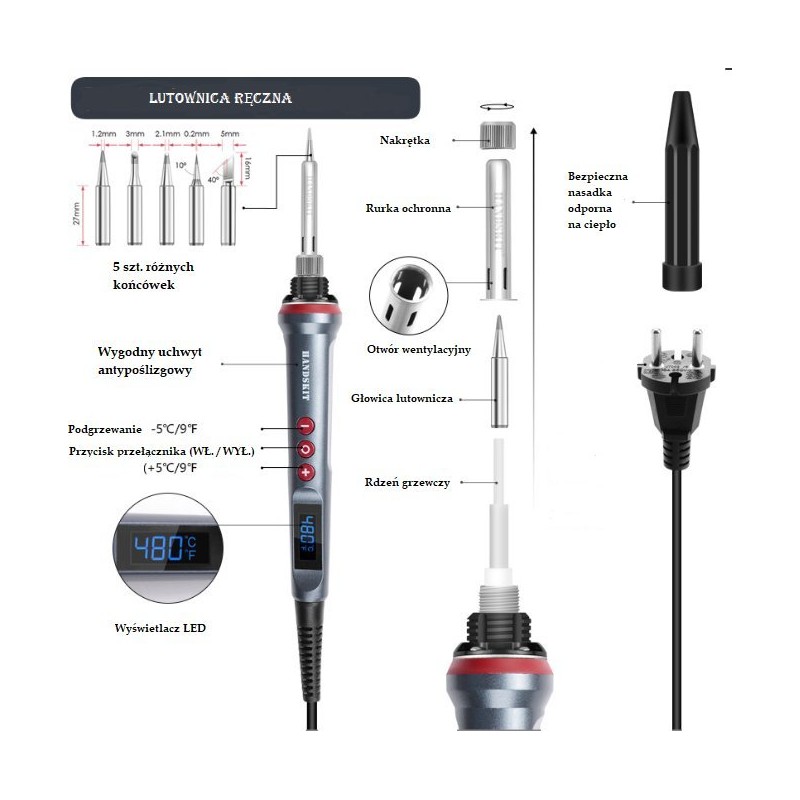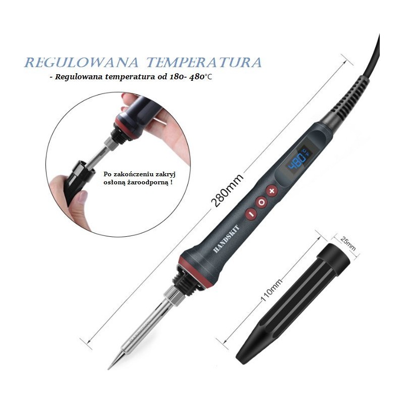 Precyzyjna lutownica elektryczna z regulacją z temperatury do 480°C jest idealna do lutowania wszelkich podzespołów elektrycznych. Dedykowana do prac z zastosowaniem lutowania ołowiowego i bezołowiowego. Łatwo wymienny grot pozwoli szybko dostosować ją do swoich potrzeb. Wyposażona w wyświetlacz LCD, na którym jest ustawiona wartość temperatury w stopniach Celsjusza. Spełni oczekiwania majsterkowicza i profesjonalisty. Lutownica wykonana jest z materiałów odpornych na wysoką temperaturę.