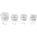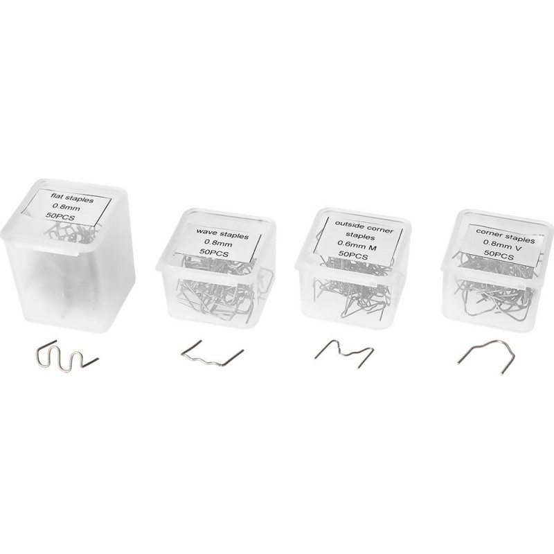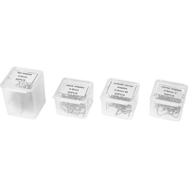 W zestawie znajduje się 200 zszywek w czterech różnych kształtach, co pozwala na elastyczne dopasowanie do potrzeb naprawczych. Dzięki temu użytkownik może wybrać odpowiedni kształt zszywki do konkretnego zadania, co zwiększa efektywność pracy.