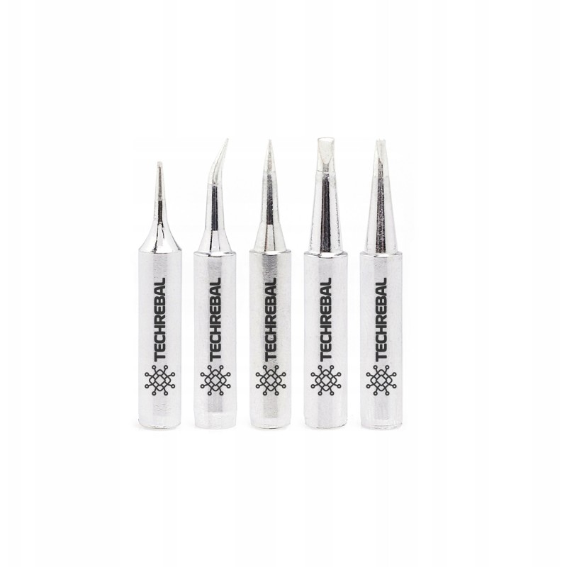 W zestawie znajduje się pięć uniwersalnych grotów Techrebal, które są dostosowane do większości prac lutowniczych. Dzięki nim użytkownik może swobodnie dobierać narzędzie do konkretnego zadania, co zwiększa efektywność pracy.