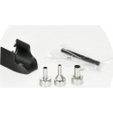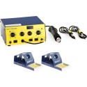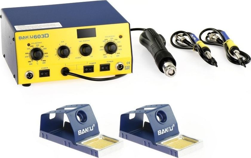 Specification: Model: 603D SMD hot air 3 in 1 LED digital display Rework Station Power: 800W Blower Fan: Brushless Fan Amount of Wind: 120L/min(MAX) Soldering Iron Temp: 200?~480? Air Temperation Range: 150?~500? Handle length: 120cm Weight: 5kg Noises: <45db Operation Instruction 1.To put the unsoldering equipment ready,and leave handle on the holder 2.To connect the power 3.To set the best nozzle(large caliber nozzle preferred) 4.To switch on the power,the screen displays"---",it represents standby mode. 5.To turn the temperature switch as to set up the require temperature.To turn the airflow switch as set up the require airflow. 6.To hold the handle,so the equipment begins to heat . To adjust the revolving switch of airflow in order to select suitable airflow in order to select suitable airflow,and begin to operate normally while the temperature is stable. 7.To put back the handle on the holder after the work,mean while the unsoldering equipment switch for heating element mode automatically. while the temperature is lower than 100°C,the screen display"---".it stands for switching for heating to standby mode,and after the temperature of Heating element is less than 70°C,the equipment is on standby. 8.To switch off the power and unplug if there is no operation for a long period of time.