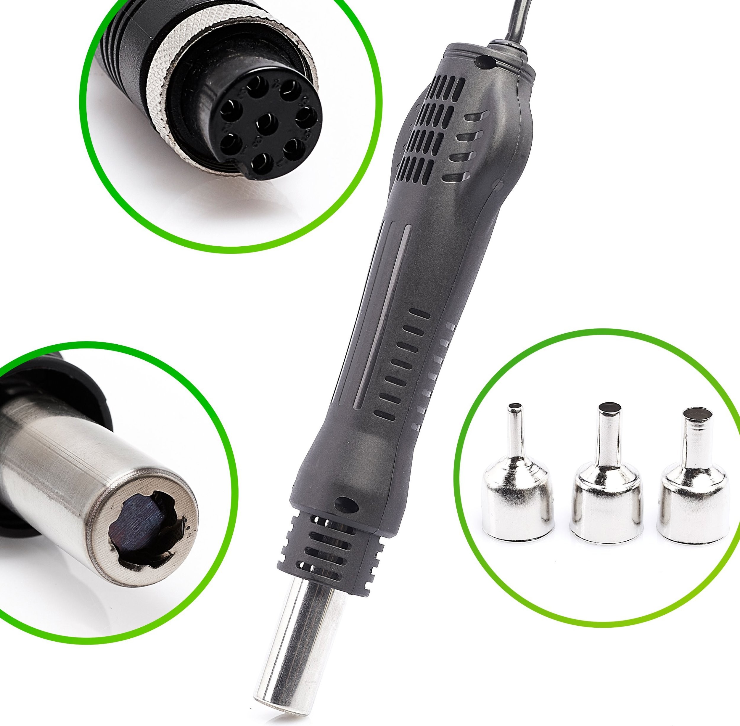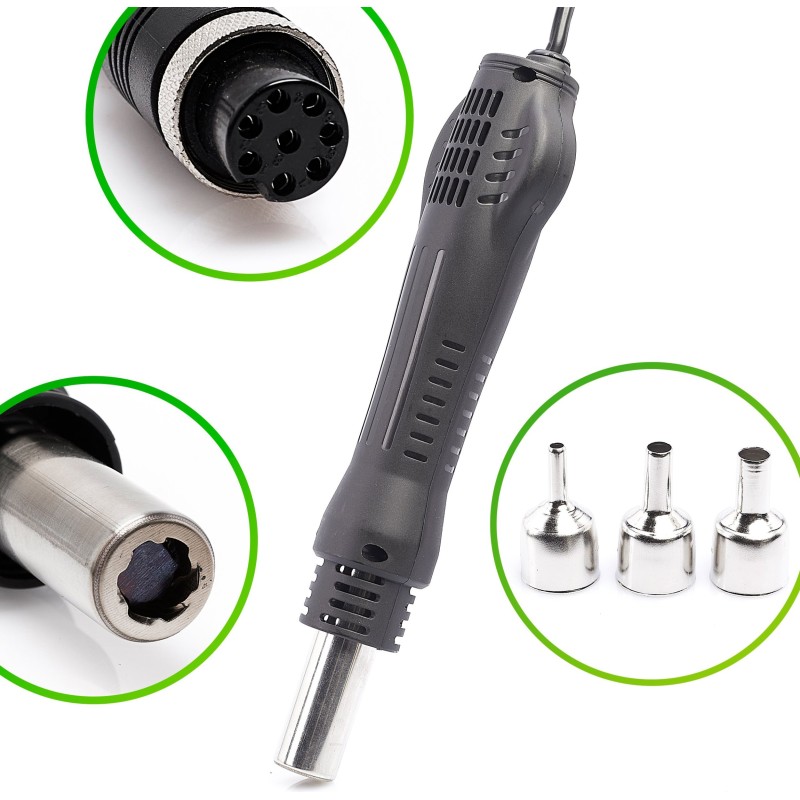 ⚡ Zaprojektowana do prac lutowniczych z takimi komponentami jak układy SOIC, QFP, PLCC, BGA, SMD itd. Jak również nagrzewaniem, wygrzewaniem koszulek termokurczliwych, rozmrażaniem, rozpuszczaniem klejów, opalaniem farb, podgrzewaniem itp.