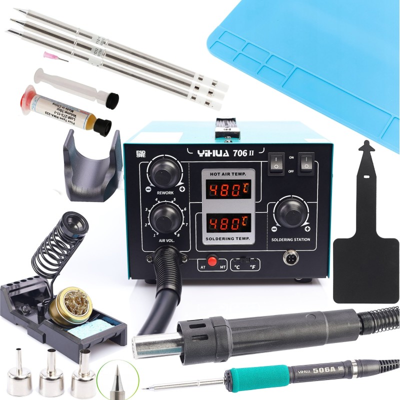 Profesjonalna stacja lutownicza 2w1 Hot-Air + system T12 Yihua 706 II + zestaw akcesoriów do lutowania