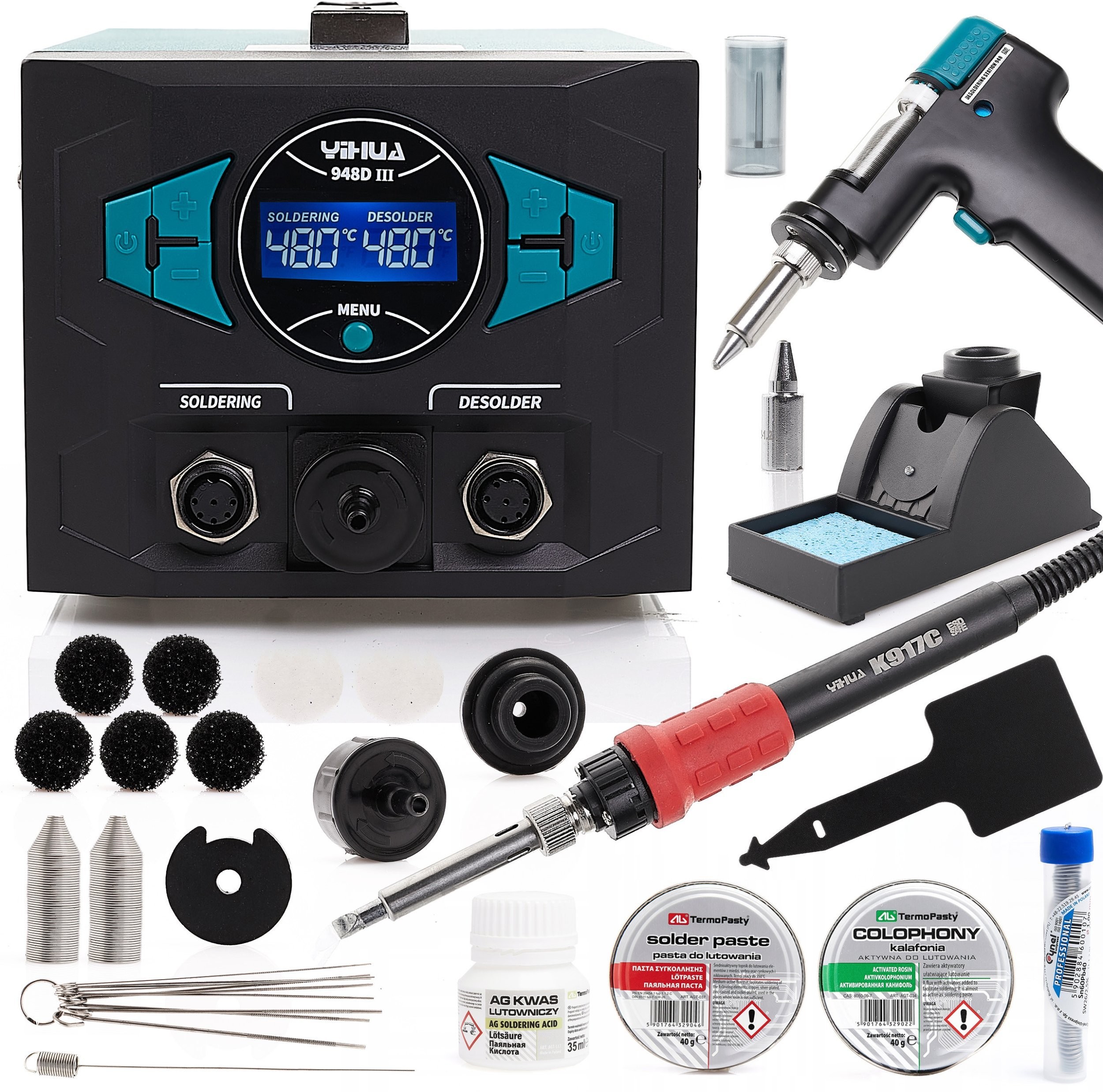 Stacja Lutownicza Rozlutownicza Yihua 948D-III Pasta Kalafonia 2x Cyna Kwas