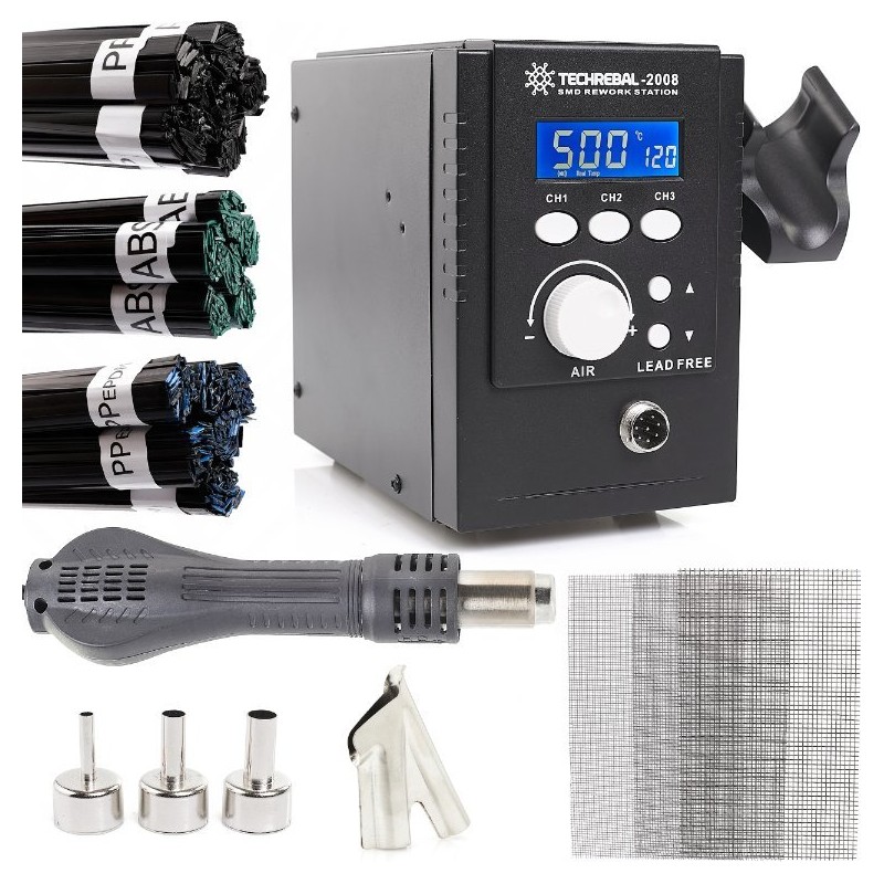 Zestaw Lutowniczy Stacja Hot-Air Techrebal 2008 + Siatki do spawania plastiku Sztywna, Pół-szt., Elastyczna + Spoiwa ABS, PP, PP/EPDM