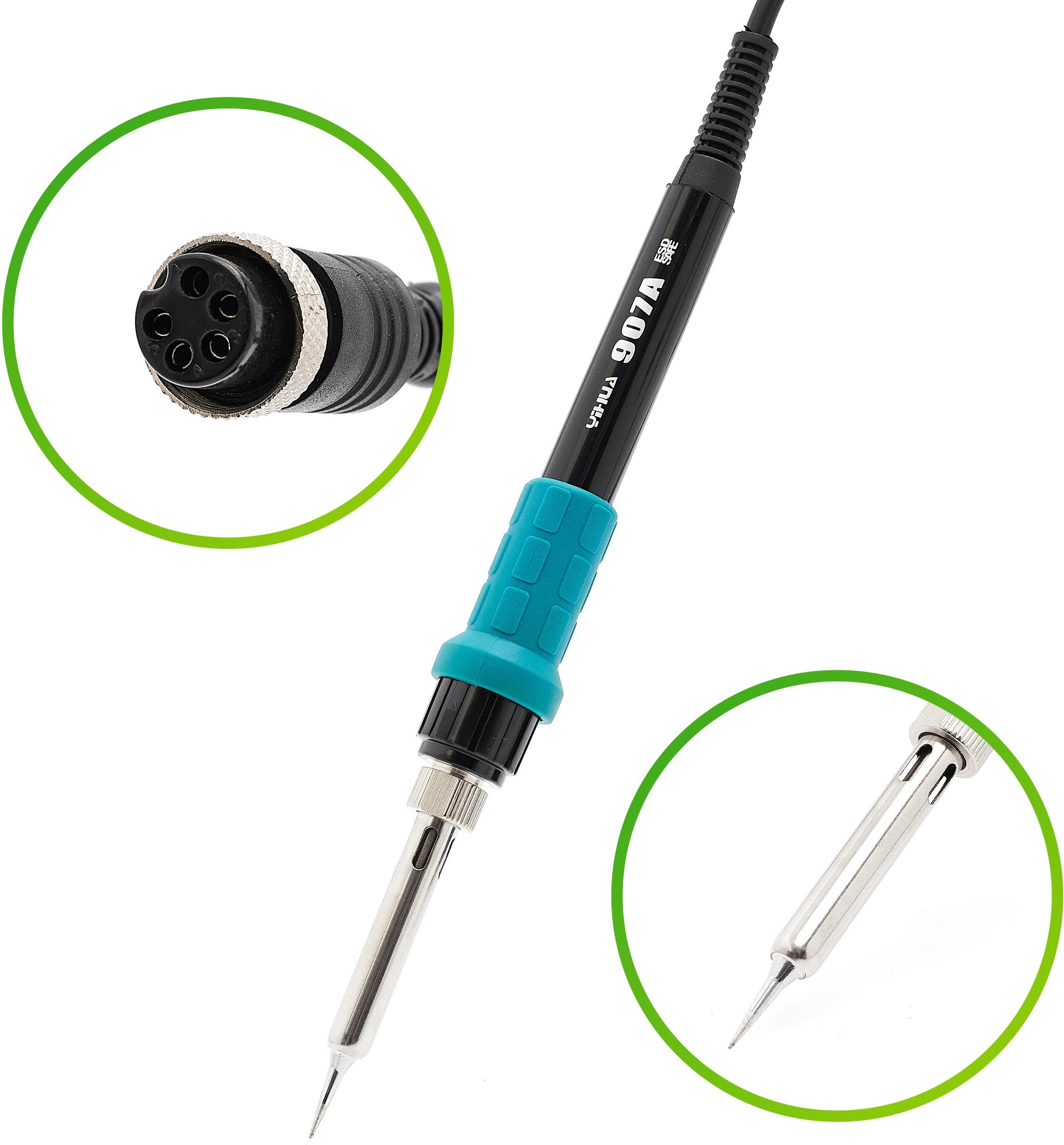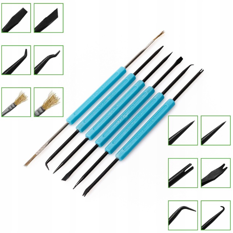 W zestawie znajdują się niezbędne akcesoria, takie jak kolba grotowa model 907A, kolba gorącego powietrza, różne dysze oraz narzędzia wspomagające lutowanie. Dzięki temu użytkownicy mają wszystko, co potrzebne do skutecznego lutowania w jednym miejscu.