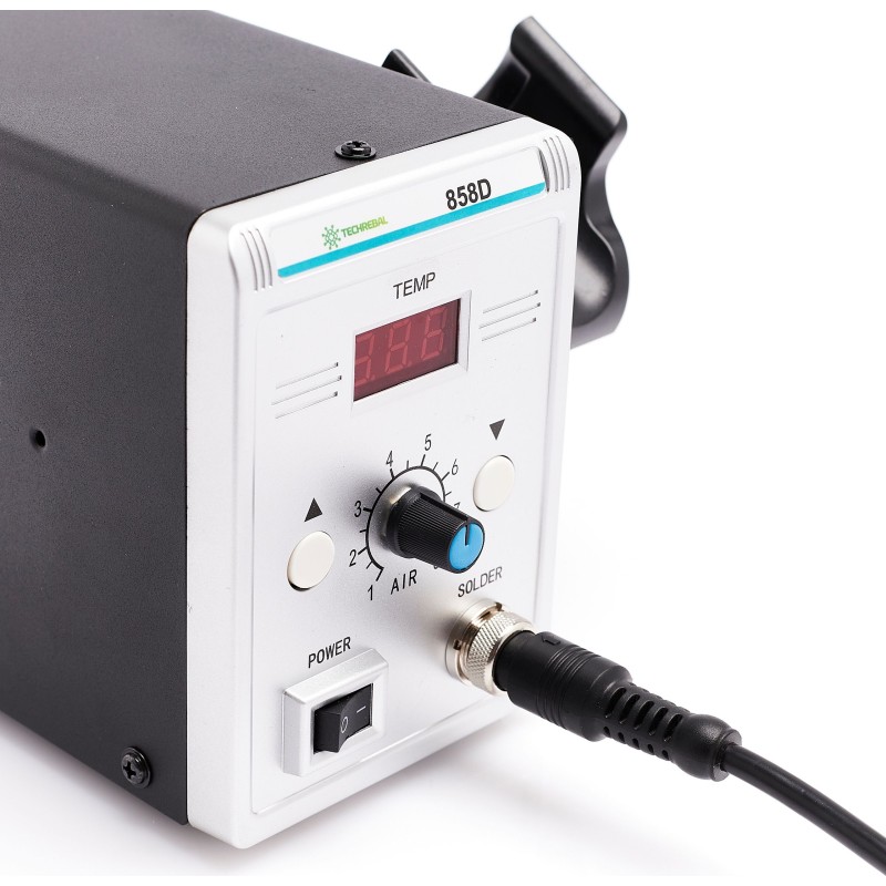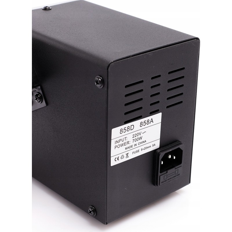 Mocna grzałka w powoduje błyskawiczne nagrzanie do żądanej temperatury. Dodatkowo stacje napędza wbudowany w kobie wentylator który jest praktycznie bezszelestny, oraz nie wywołuje wibracji co jest bardzo komfortowe podczas prac. Wentylator z silnikiem bezszczotkowym - wzmocniona trwałość oraz cicha praca. 858D wyposażona jest w elastyczny przewód kolby, który zwiększa mobilność, oraz wygodę pracy. Stacja wyposażona jest w czujnik odłożenia - w przypadku gdy kolba gorącego powietrza zostaje odłożona na uchwyt, automatycznie chłodzi się do 100°C, po czym przechodzi w stan czuwania (grzałka zostaje wyłączona). Jest to rozwiązanie które przedłuża żywotność elementu grzejnego. Gdy kolba zostaje zdjęta z uchwytu wraca do wcześniejszych ustawień i nagrzewa się do zadanej temperatury.