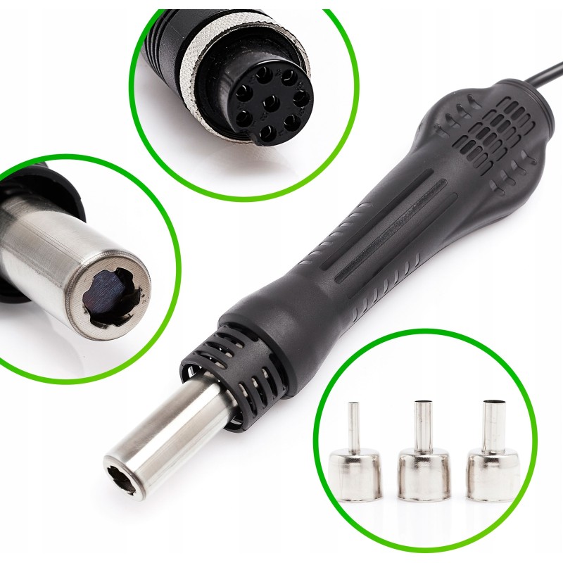 Lutownica na gorące powietrze (hotair) o mocy 700W. Urządzenie charakteryzuje kompaktowa obudowa, która zajmuje niewiele miejsca, Stacja posiada regulowaną temperaturę od 100 °C do 500 °C oraz moc nadmuchu. Jako jedyna ze stacji tego typu dostępnych na rynku posiada możliwość szybkiej kalibracji! (Instrukcja pod opisem)