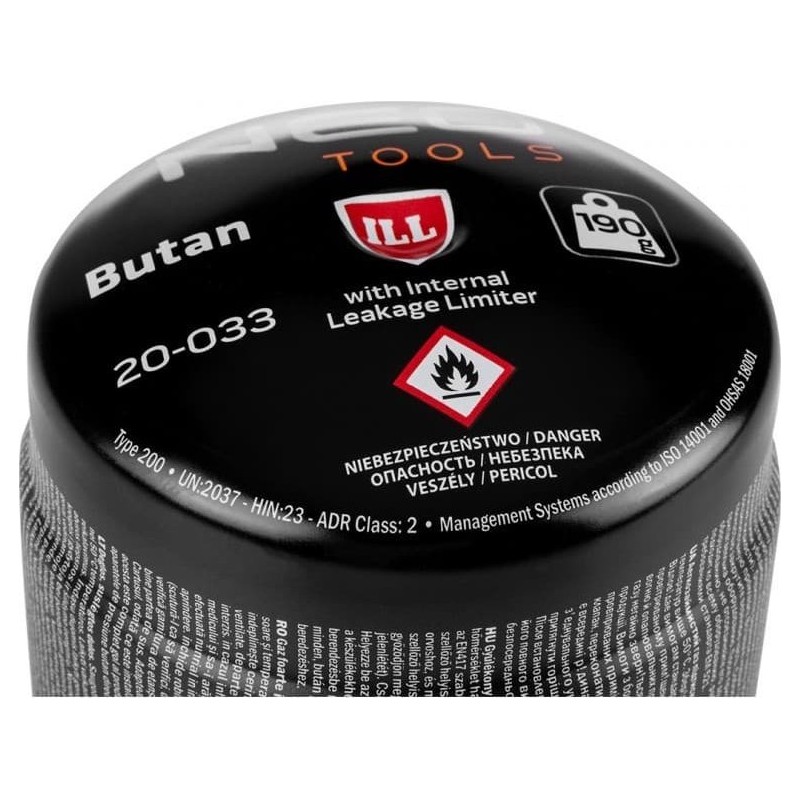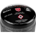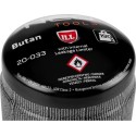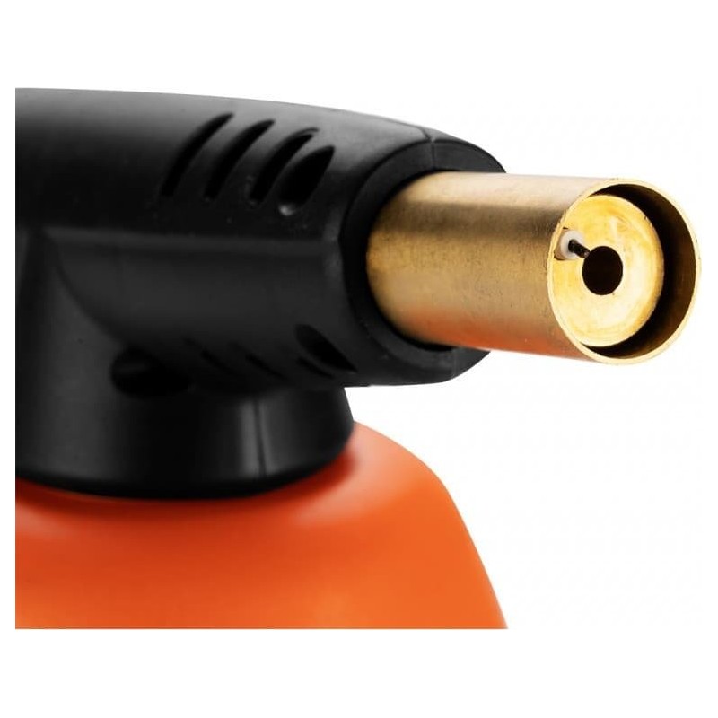 Lampa lutownicza gazowa na naboje 190 g, temperatura pracy 1350°C, moc 1.2 kW, średnie zużycie gazu 87 g/h, palnik wykonany z mosiądzu, zapłon piezo, obudowa z tworzywa, 4 Naboi z gazem butan 190g, system blokowania wypływu gazu