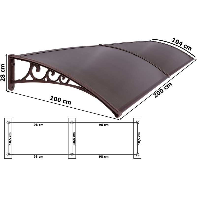 Daszek plastikowy Dako Duo 100x200cm brązowy⭐️ Skuteczna ochrona drzwi przed warunkami atmosferycznymi ⭐️ Odporny na promieniowanie UV ⭐️ Mocna i stabilna konstrukcja ⭐️ Samodzielna instalacja⭐️ Nie wymaga konserwacji⭐️ Zakup od producenta✨Daszek plastikowy nad drzwi Dako Duo 100x200 – Praktyczna osłona do domu i biura✨Zyskaj ochronę i styl w jednym – daszek nad drzwi Dako Duo 100x200 cm brązowy to skuteczna osłona przed deszczem, śniegiem i słońcem, która zabezpiecza drzwi i osoby wchodzące do domu. Montujesz go samodzielnie, bez potrzeby wynajmowania fachowca. Solidna konstrukcja z filtrem UV to gwarancja trwałości i estetyki na lata. CechyMateriał pokrycia: Poliwęglan komorowyKolor konstrukcji: BrązowyMocowania: Tworzywo sztuczne + aluminiumGrubość płyty: 5,2 mmFiltr UV: TakTyp montażu: Ścienny, samodzielnyW zestawie: 6x wkręty, 6x kotwy, 6x zaślepki, instrukcjaZapewnia skuteczną ochronę przed warunkami atmosferycznymiTrwały materiał i stabilna konstrukcjaEstetyczny design Wymiary zadaszeniaDługość: 100 cmSzerokość: 200 cmWysokość: 28 cmGłębokość: 104 cm Informacje dodatkowePrzedstawione kolory należy traktować poglądowo - mogą odbiegać od rzeczywistych ze względu na różne ustawienia monitorów oraz proces obróbki zdjęć. Rzeczywiste wymiary mogą się różnić od podanych wyżej. Tolerancja błędów może wynosić +/- 5%. Marka:GockowiakKod produktu:331835MGKod EAN:5902340331835Kolor:brązowySzerokość:200 cmDługość:100 cmGrubość płyty:5,2 mmMateriał:poliwęglan, tworzywo sztuczne