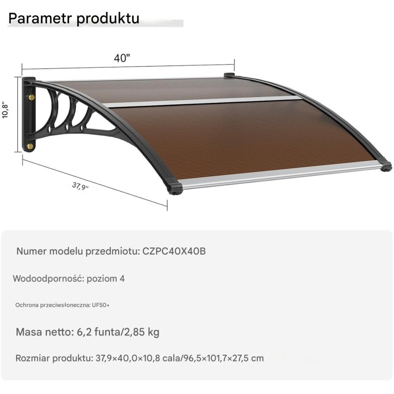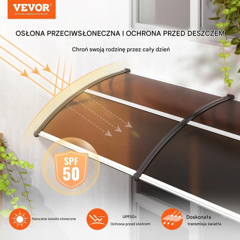 - Zawartość zestawu: 1 x Daszek z poliwęglanu, uchwyty ABS, łączniki aluminiowe, instrukcja montażu