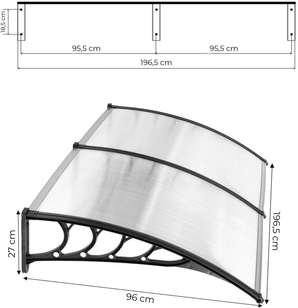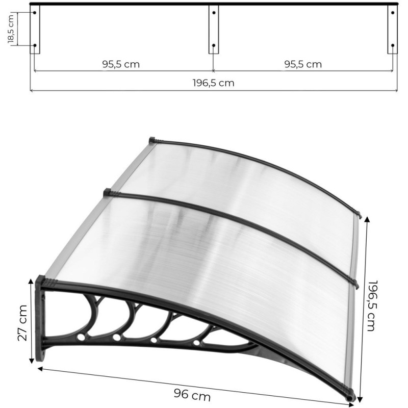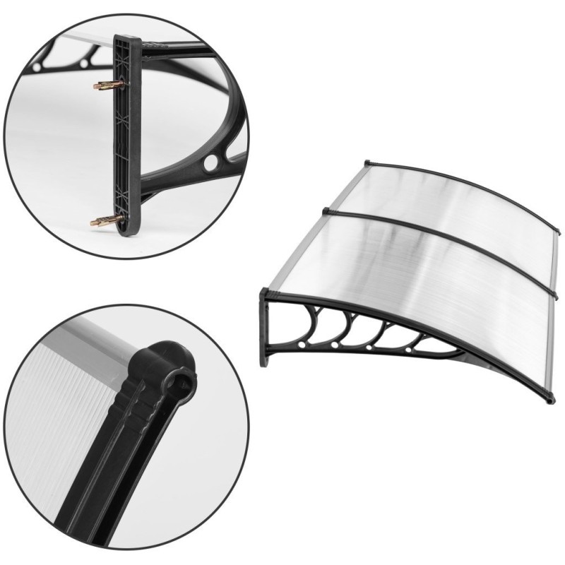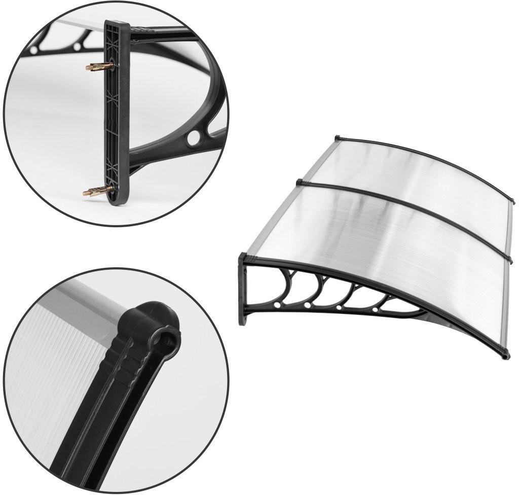 - Boczne elementy zadaszenia, które utrzymują całość konstrukcji wykonano z wytrzymałego tworzywa, dzięki temu konstrukcja jest odporna na silne podmuchy wiatru. Daszek montowany jest do fasady 6 wkrętami, które znajdziesz w zestawie.