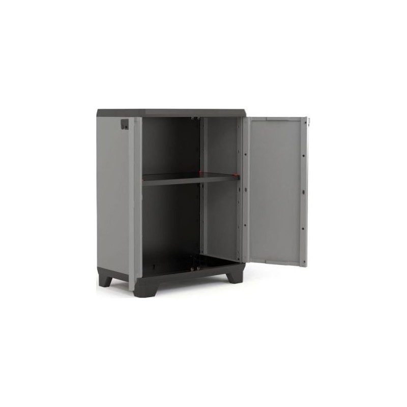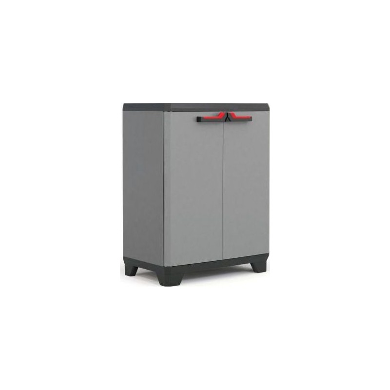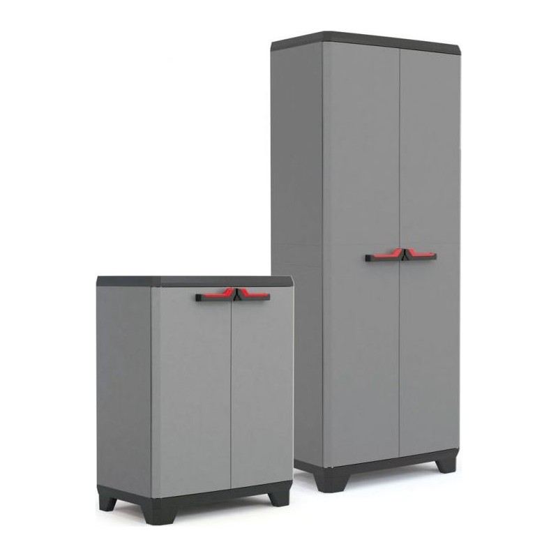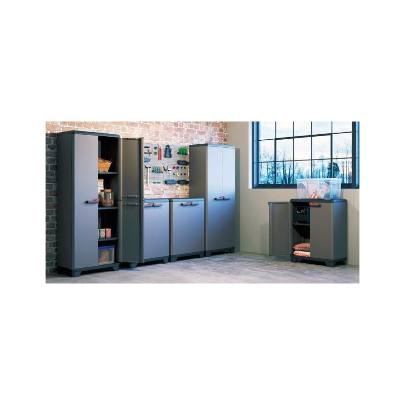 Szafka jest świetnym pomocnikiem w organizowaniu różnych rzeczy. - wewnątrz szafki znajdują się półki, które można dowolnie rozmieścić. - pojemność każdej półki wynosi do 15 kg. Montaż szafki przez firmy zajmuje około dziesięciu minut.Szafka wyposażona jest w sztywne ucho, do mocowania zapięcia. Idealna do umieszczenia w warsztacie, garażu lub piwnica. Dane techniczne: wysokość produktu: 90 cm szerokość produktu: 68 cm długość produktu: 39 cm ładowność: 15 kg (jedna półka) materiał: plastik kolor: szary Zawartość opakowania: 1x szafka STILO LOW