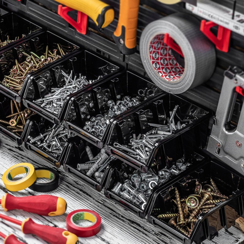 MODUŁOWA BUDOWA – ścianka narzędziowa ma konstrukcję modułową, dlatego możesz dowolnie poukładać akcesoria i rozbudować ją o kolejne elementy. Powiesisz na niej zarówno kuwety warsztatowe, półki i wieszaki na narzędzia.