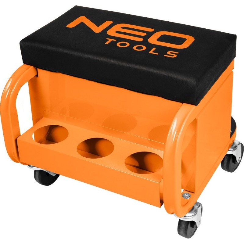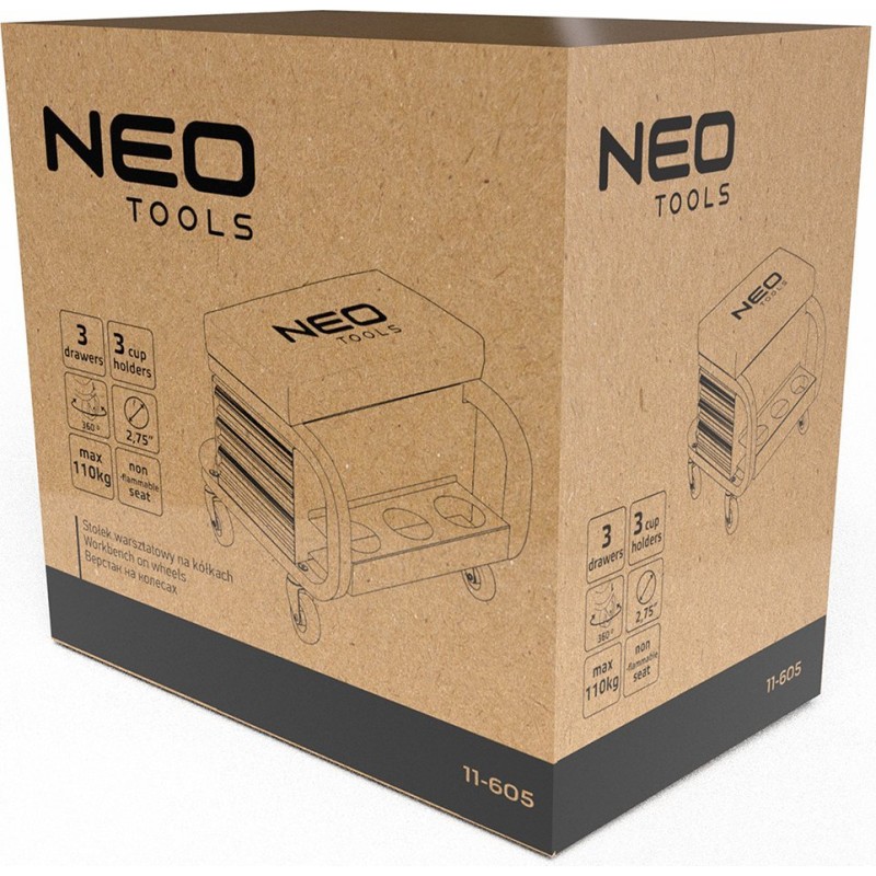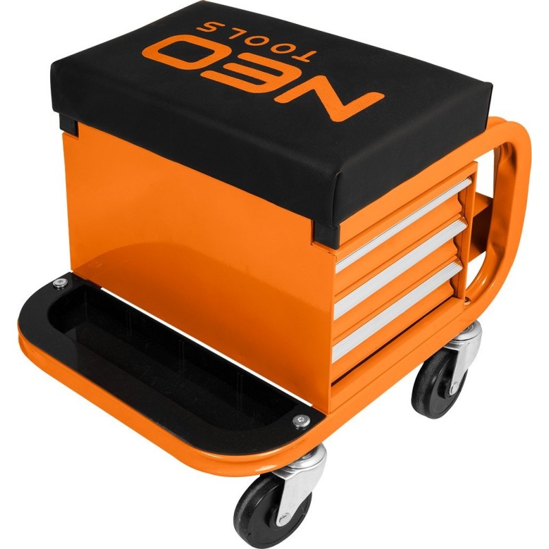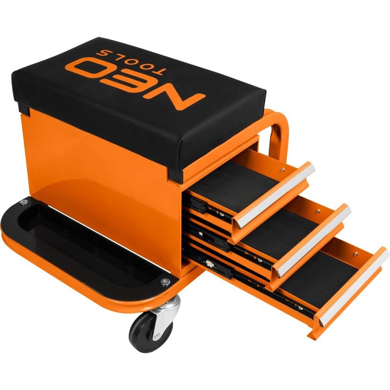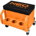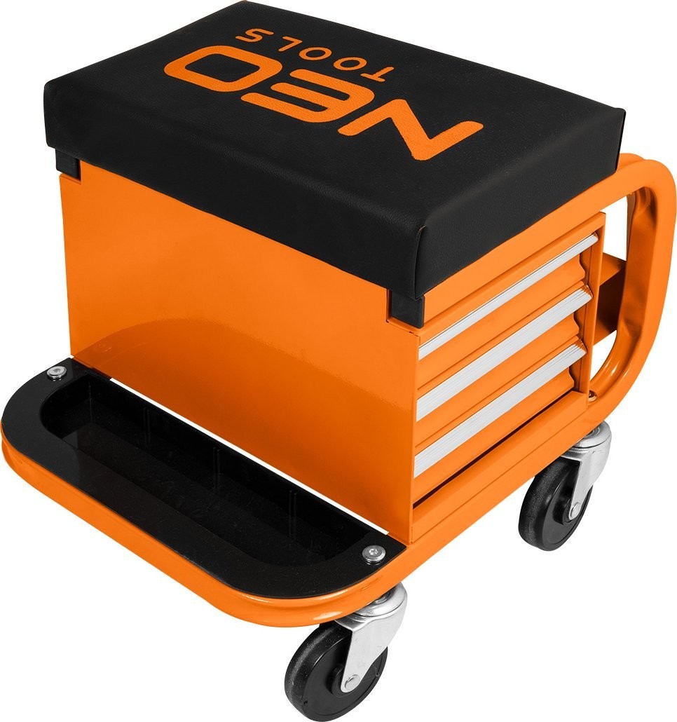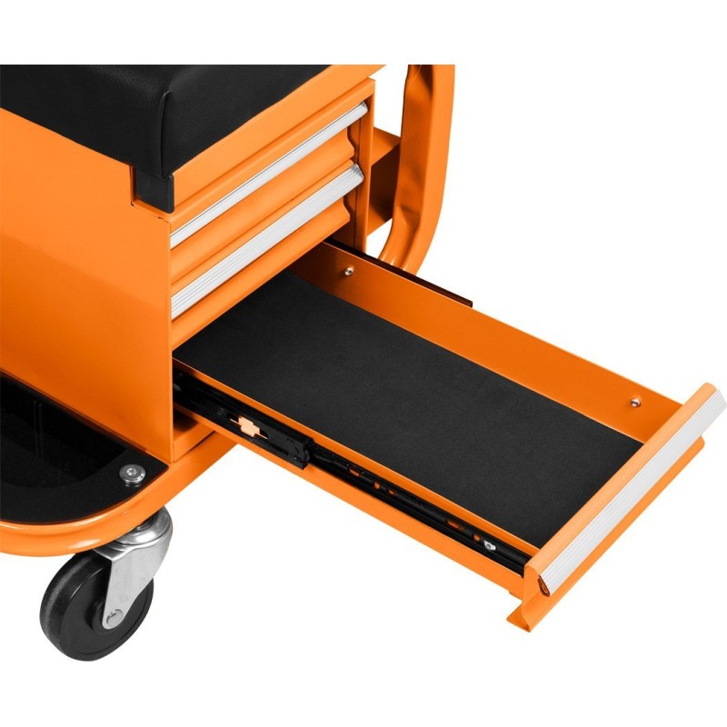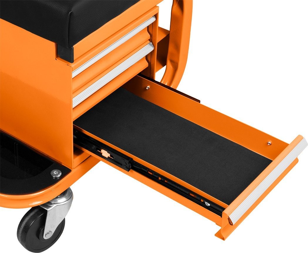 Stołek warsztatowy na kółkach z szufladami na narzędzia, malowany proszkowo, wytrzymałość 110 kg, wymiary stołka 38x37x39 cm, wymiary szuflady 30x15x4 cm, pianka w szufladach, 4 kółka 360 st. o średnicy 70 mm, 3 uchwyty na puszki/butelki/spraye o średnicy 70 mm