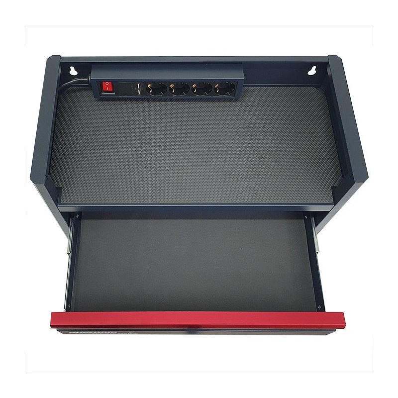 Wbudowana listwa zasilająca z czterema gniazdami oraz dwoma portami USB typu USB-A umożliwia łatwe podłączenie różnych urządzeń, co czyni szafkę niezwykle praktyczną. Dzięki temu, masz wszystkie swoje elektronarzędzia w zasięgu ręki, zawsze gotowe do użycia.