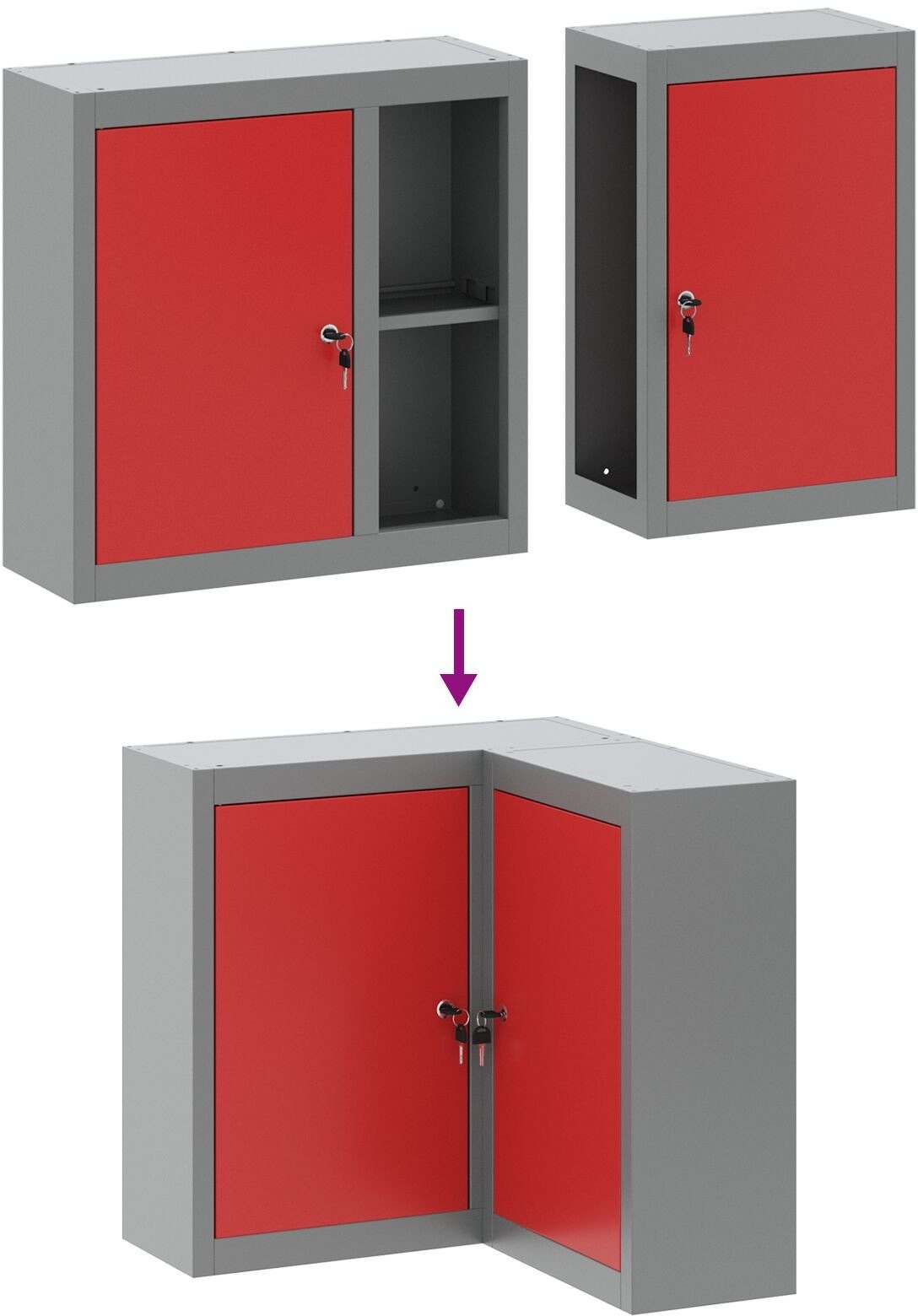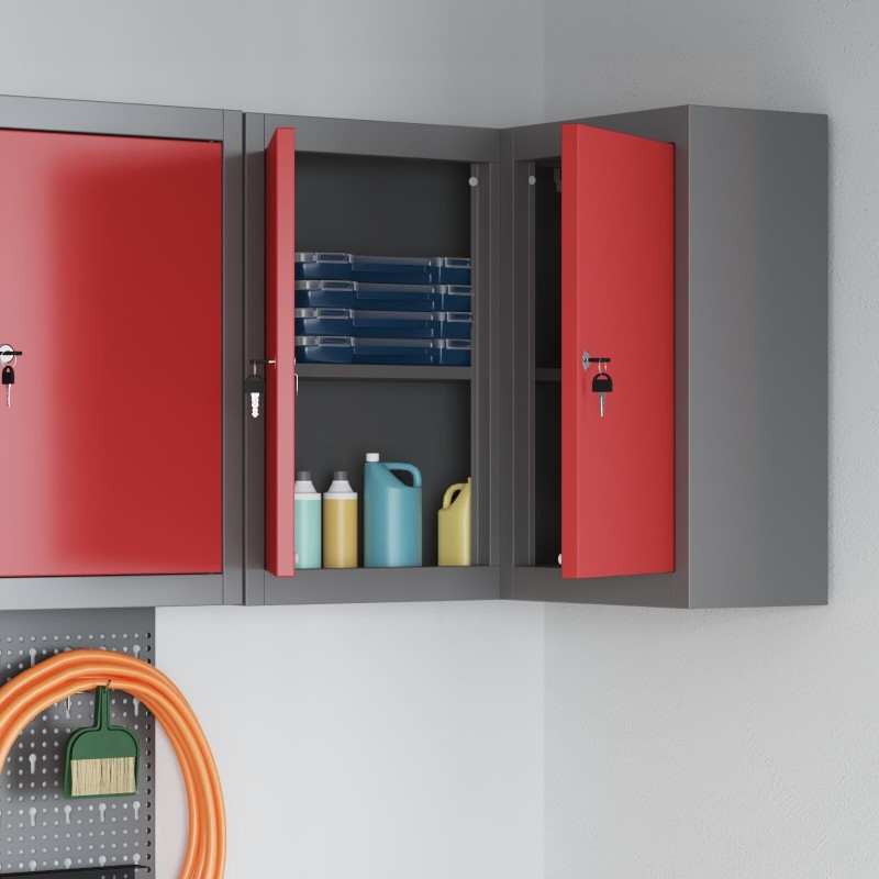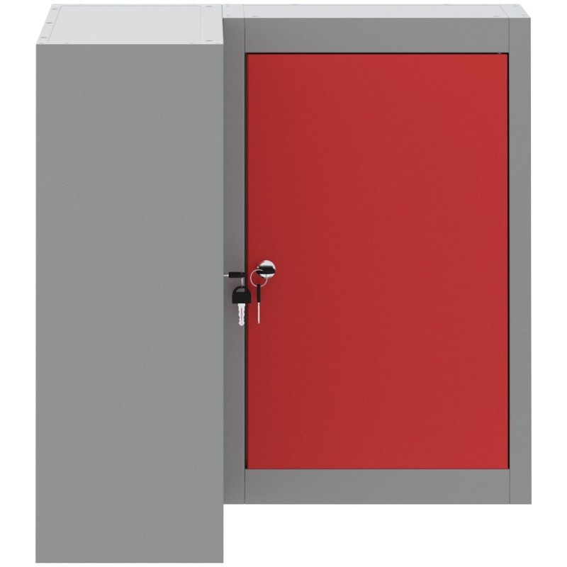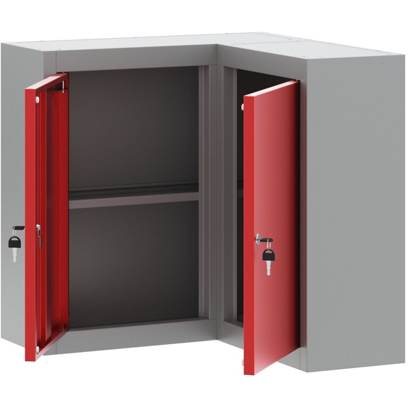 Ta narożna szafka w kształcie L to świetny sposób na ogarnięcie bałaganu w małych przestrzeniach. Ma nowoczesny wygląd w szarym kolorze ze stali walcowanej na zimno i czerwonymi akcentami, co czyni ją fajnym wyborem do Twojego pokoju hobby, warsztatu lub balkonu.